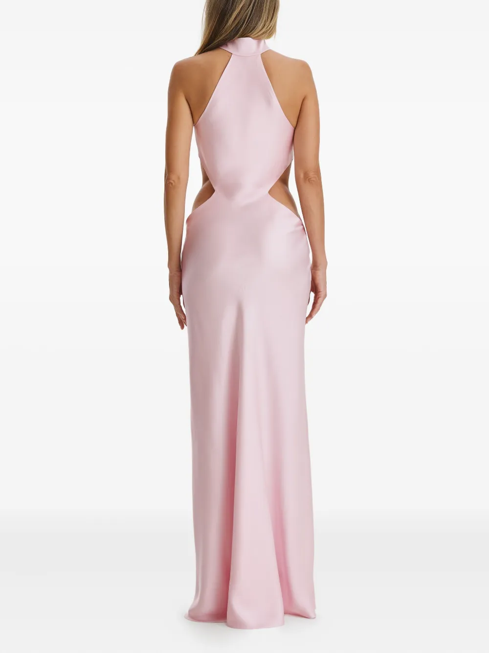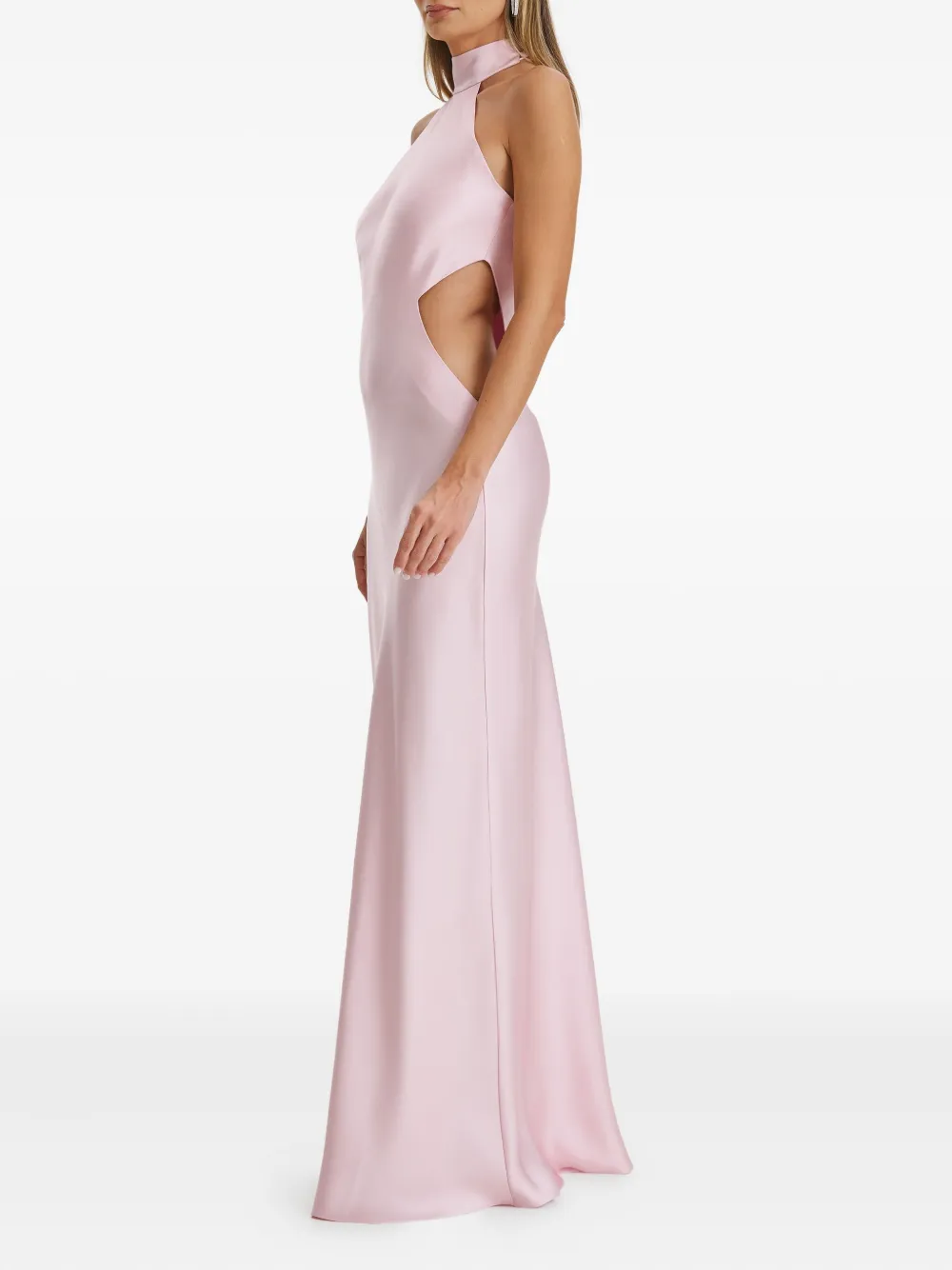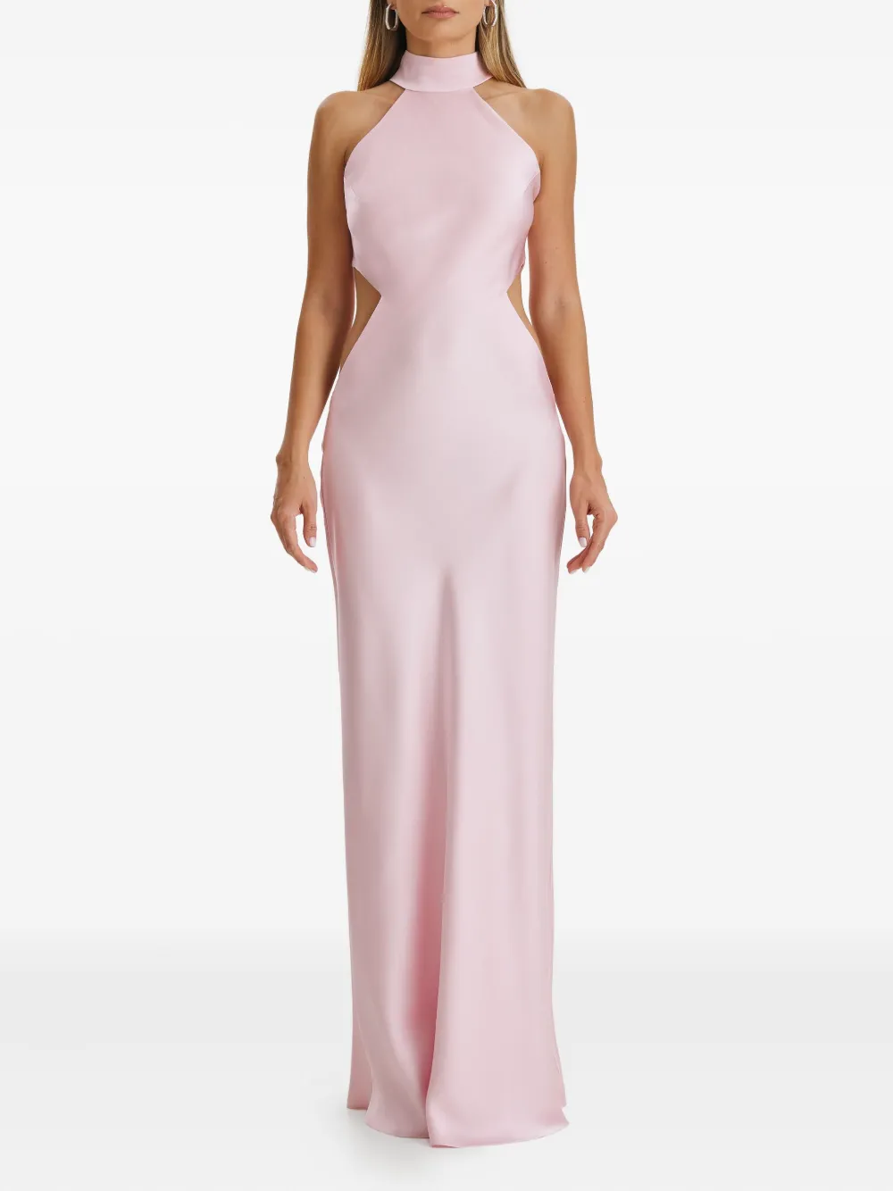 Платье макси длины по косой, без рукавов, с высоким воротником, вырезами по бокам, пудрово-розового цвета