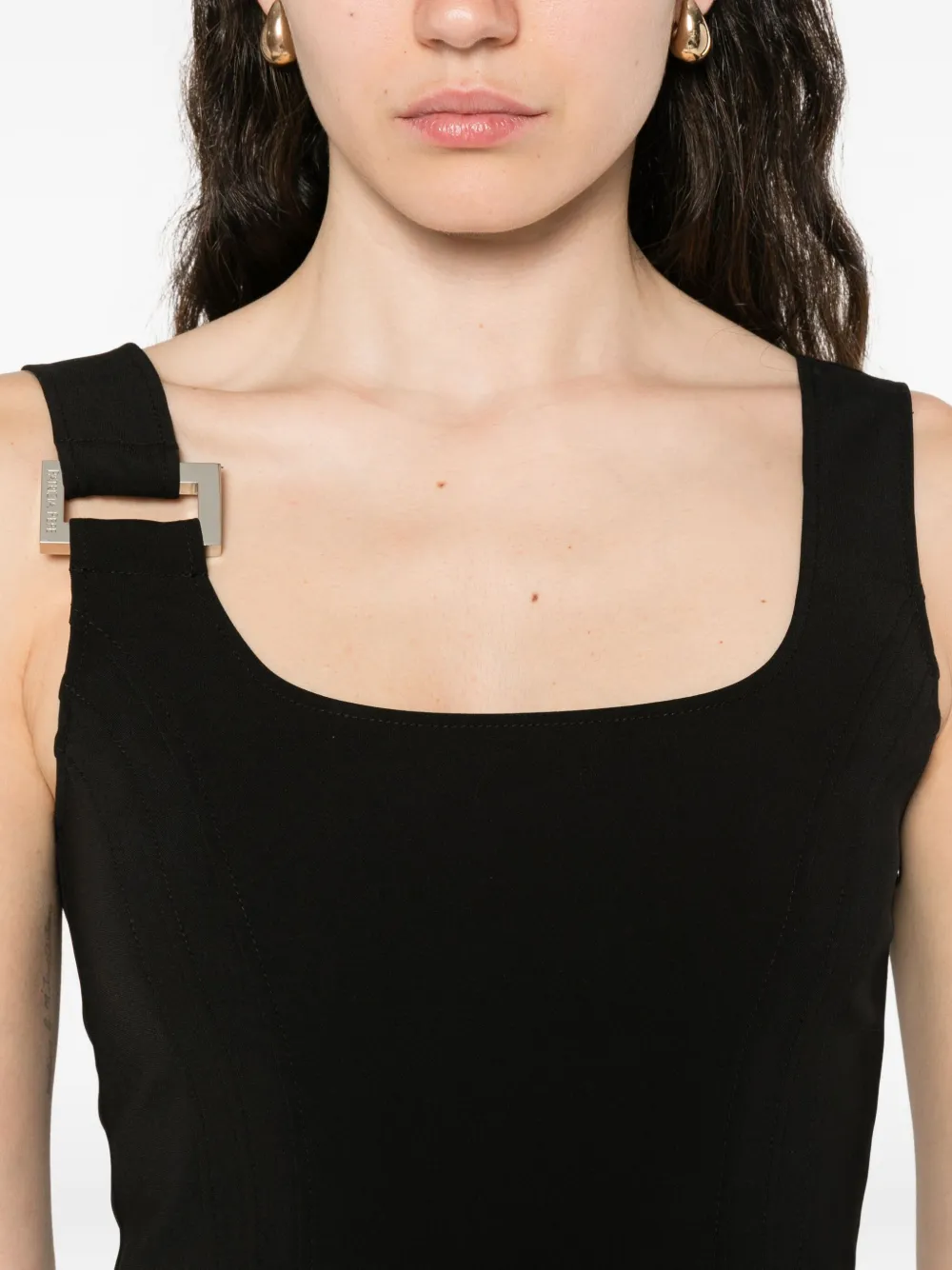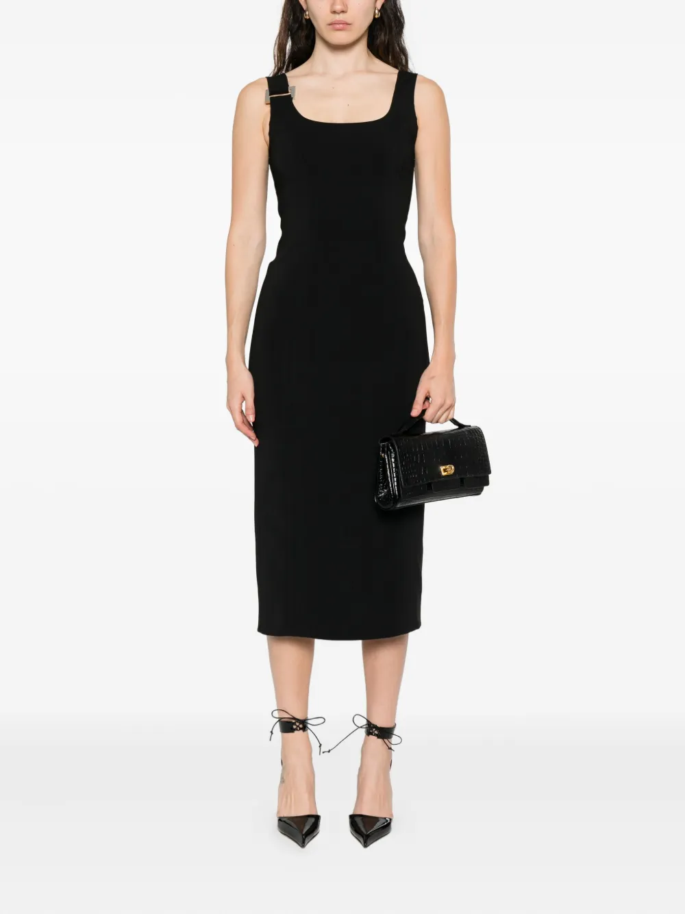Черное платье миди с квадратным вырезом, пряжками на плечевых лямках, приталенным лифом и фигурной строчкой