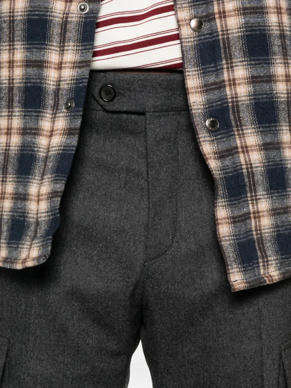 Темно-серый цвет, боковые карманы карго, застежка на пуговицы