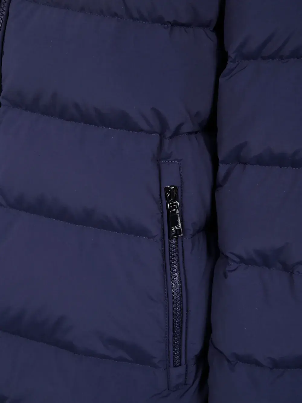 Темно-синий стеганый дизайн, высокий воротник, застежка-молния, прорезные карманы, длинные рукава