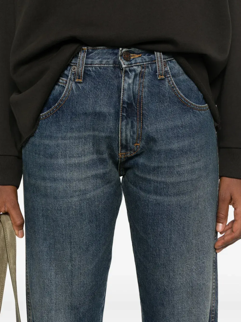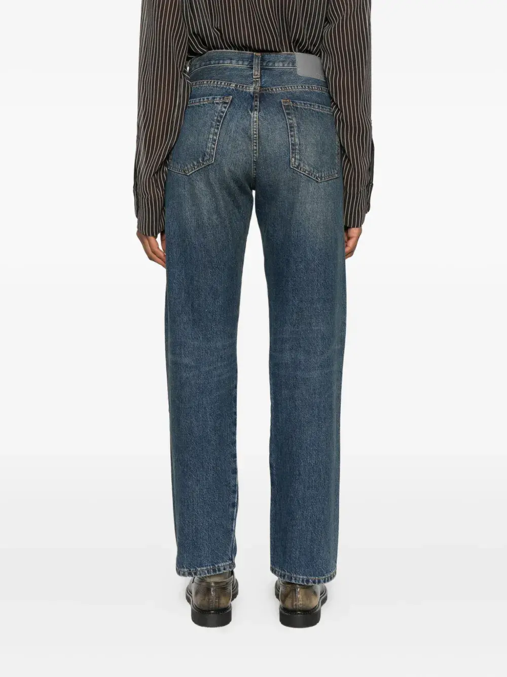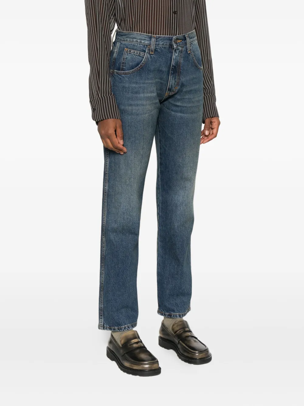 Синий прямые брючины застежка на пуговицах пять карманов темная стирка