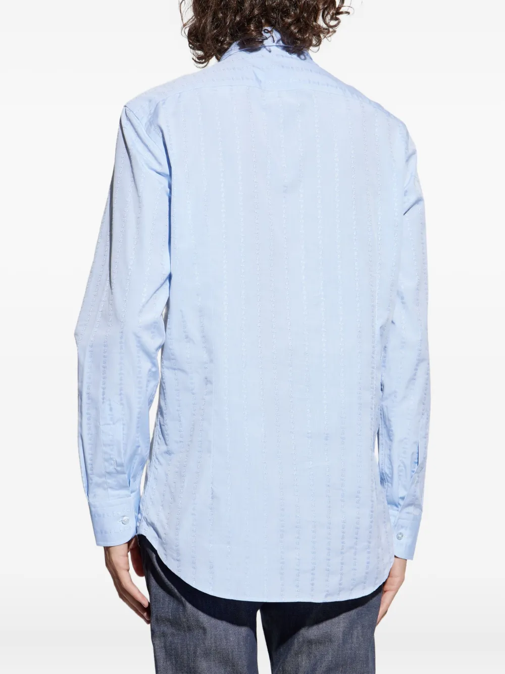 Светло-голубой цвет, узор пейсли, вышитые детали, длинные рукава, застежка на пуговицы, воротник на пуантах