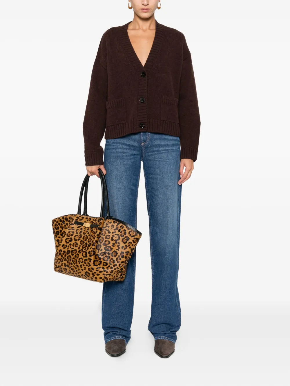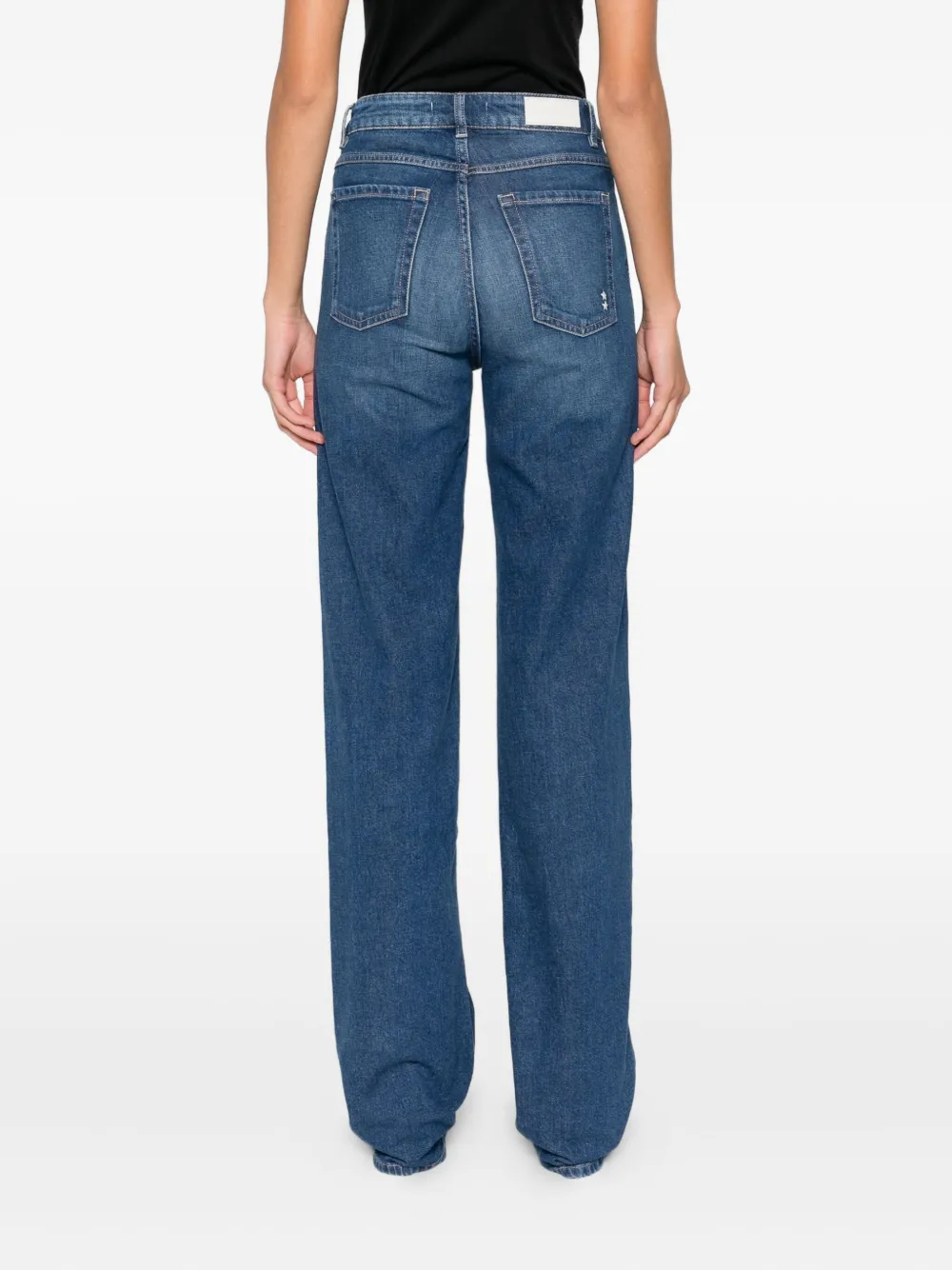 Синие джинсы с высокой талией, прямыми штанинами, пятью карманами, застежкой на пуговицы и шлевками для ремня