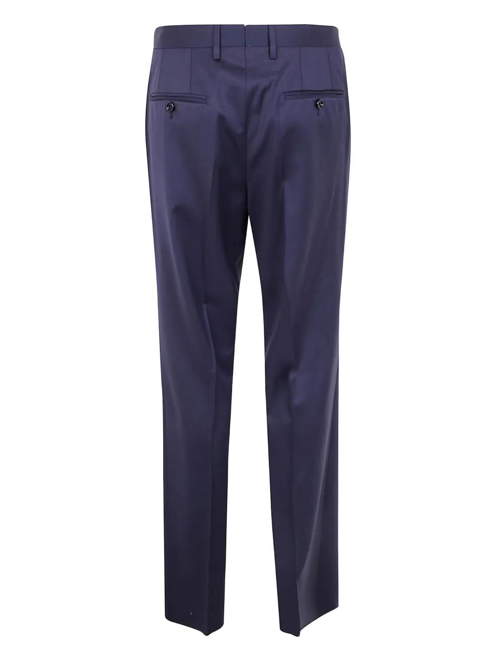 Темно-синий шерсть передние складки застежка на пуговицу и молнию боковые прорезные карманы задние карманы с листочкой