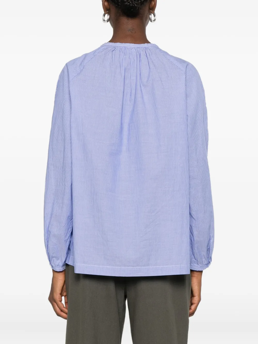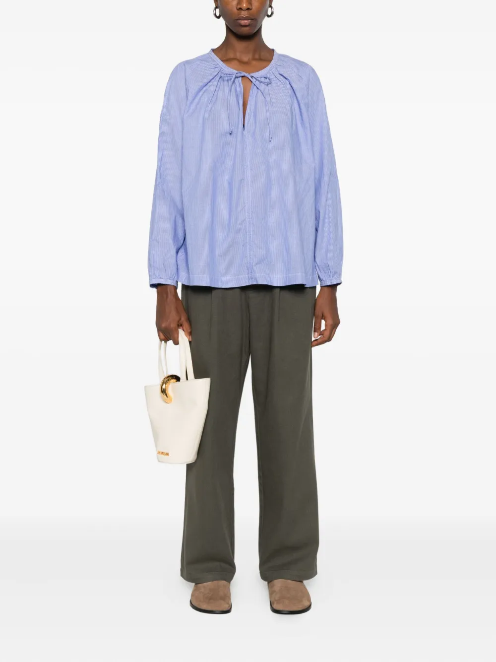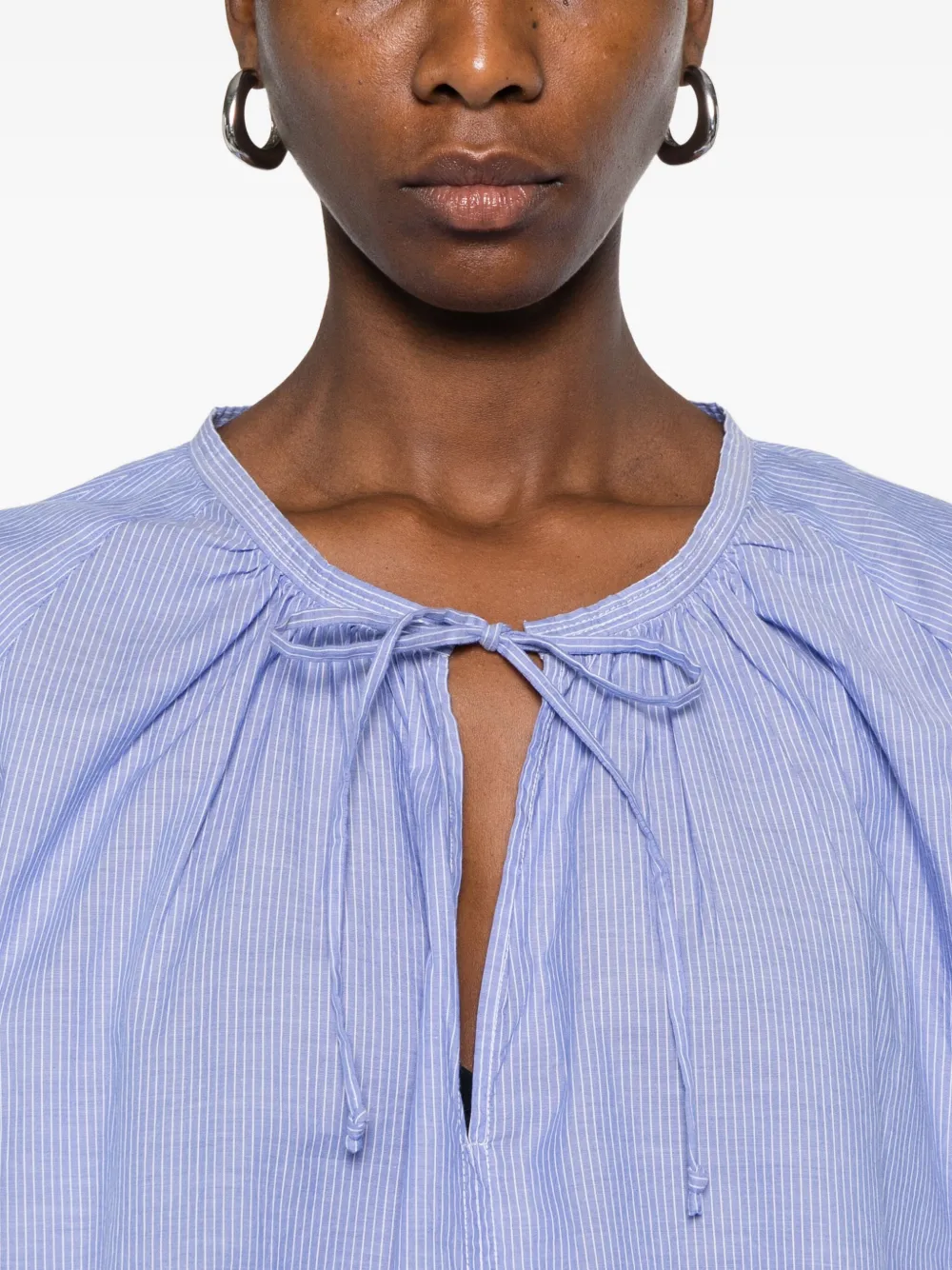 Голубая блузка в полоску с завязкой на шее, длинными рукавами, круглым вырезом и присборенной горловиной