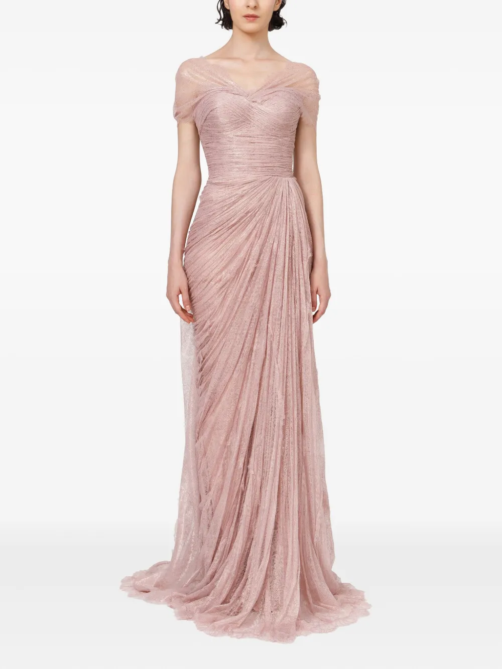 Пудрово-бежевый цветочная кружевная отделка короткие рукава V-образный вырез плиссированный лиф драпированная юбка