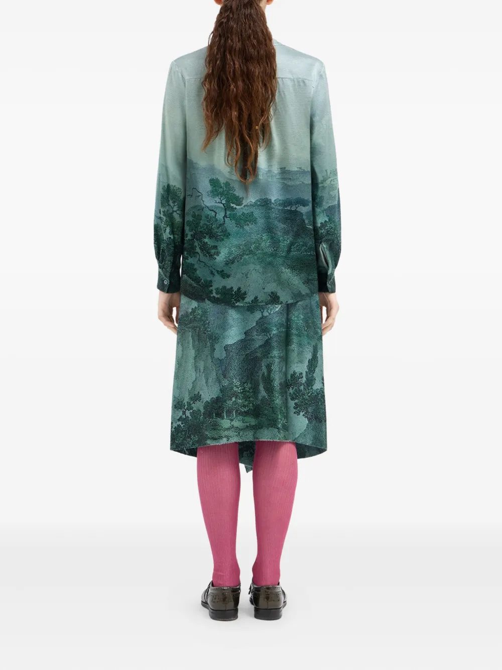 Зеленый ландшафтный принт V-образный вырез длинные рукава застежка на пуговицы