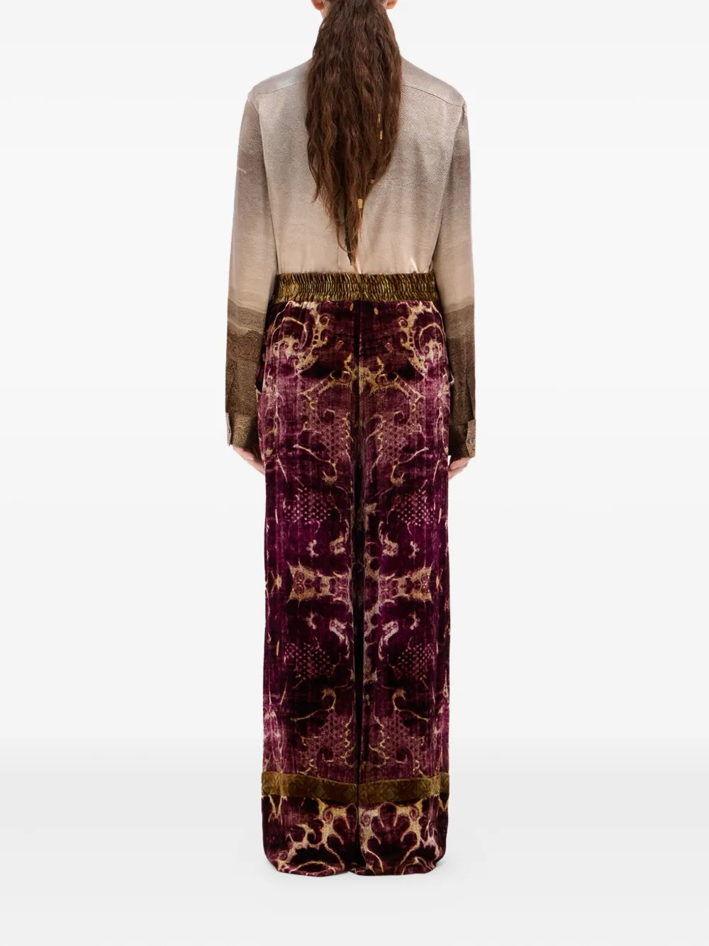 Темно-красный бархат с дамасским узором, эластичный пояс, широкие штанины, бархатистая текстура, оливково-зеленая вставка