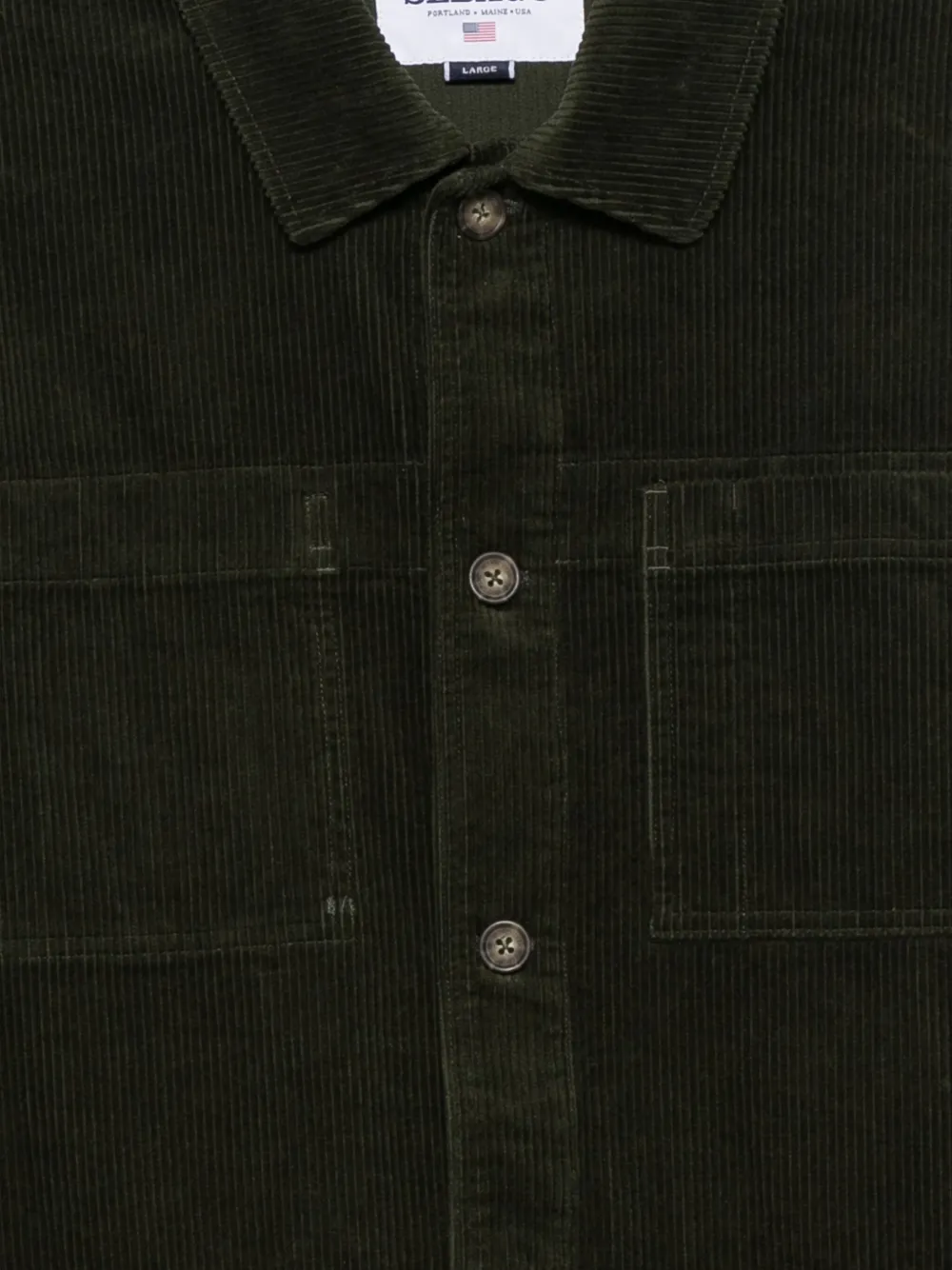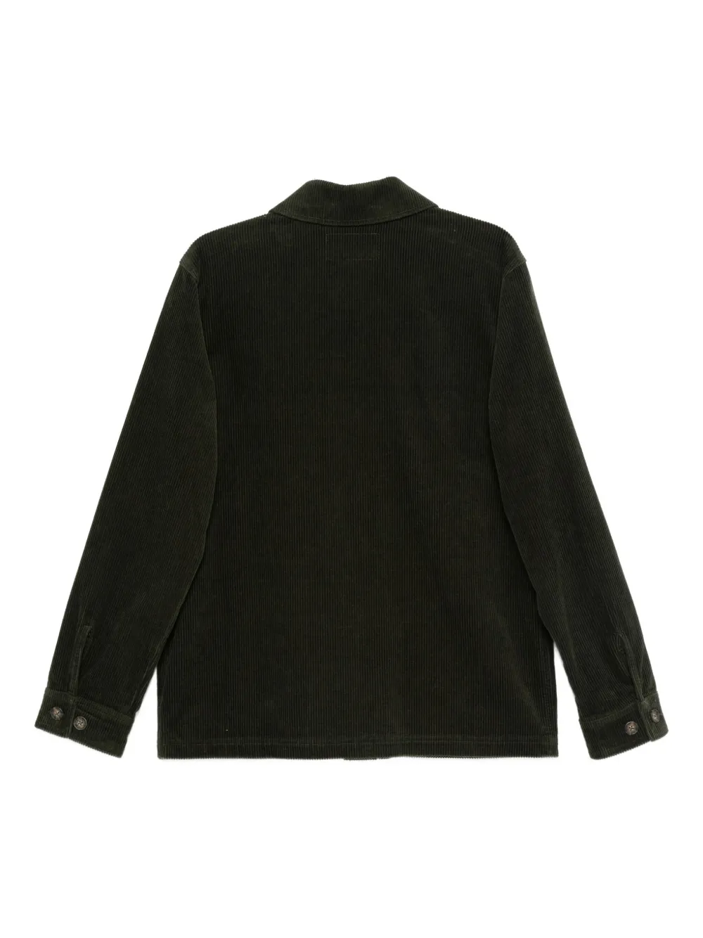 Темно-зеленая вельветовая фактура, застежка на пуговицы, множество карманов, длинные рукава
