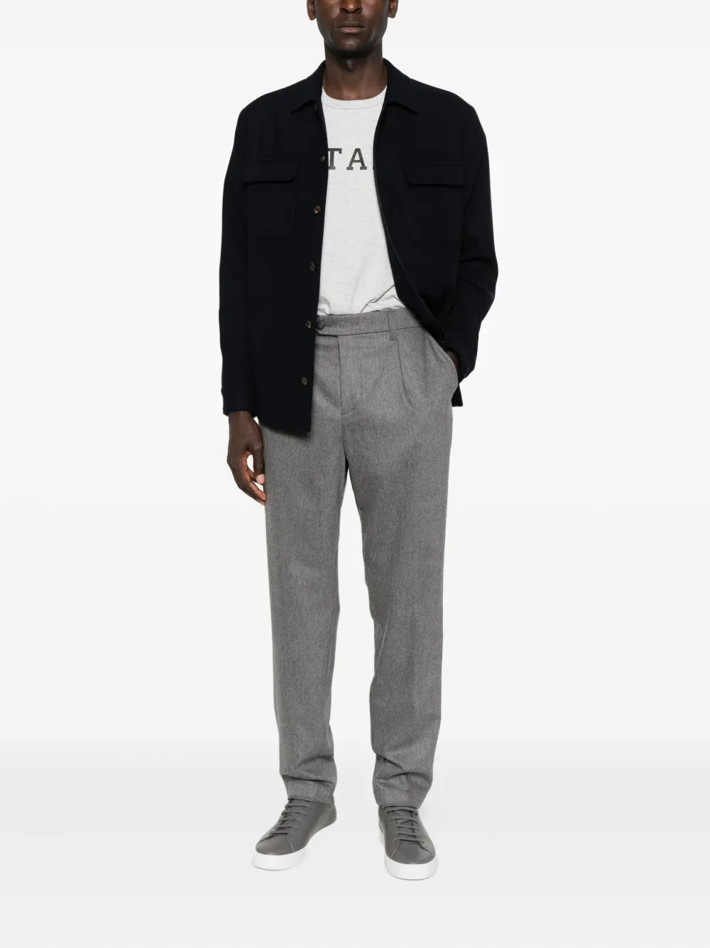 Серые брюки с прямыми штанинами, защипами спереди, застежкой на пуговицах, боковыми карманами и подвернутыми краями