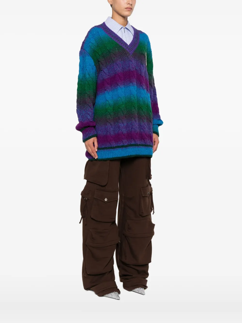 Синий/фиолетовый/зеленый косичковая вязка V-образный вырез полосатый узор нашивка с вышивкой ребристая отделка