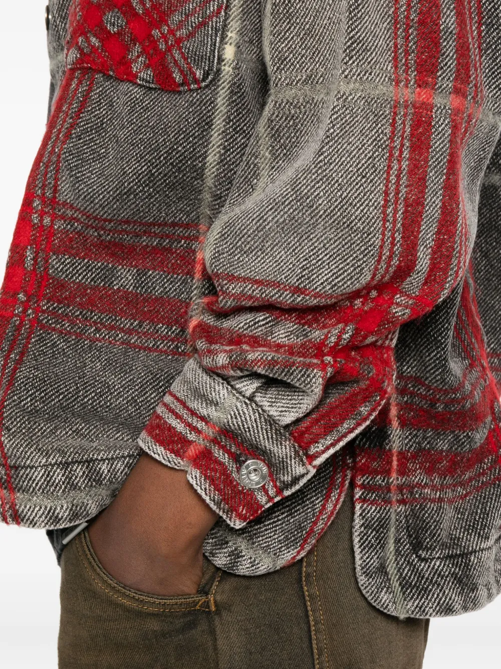 Серый клетчатый узор застежка на пуговицы спереди длинные рукава два накладных кармана с клапанами прямой подол