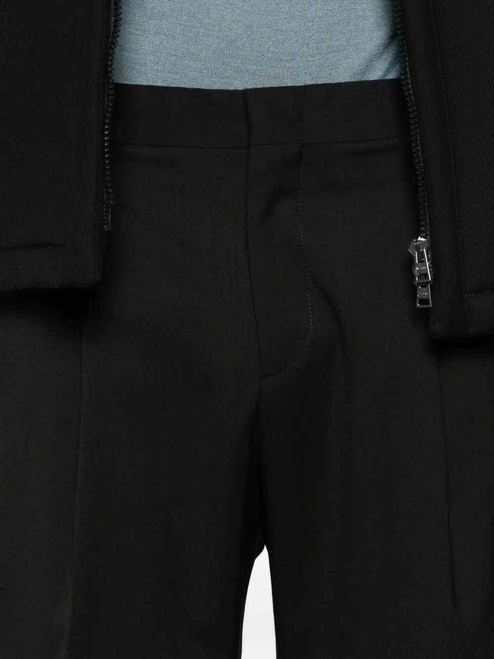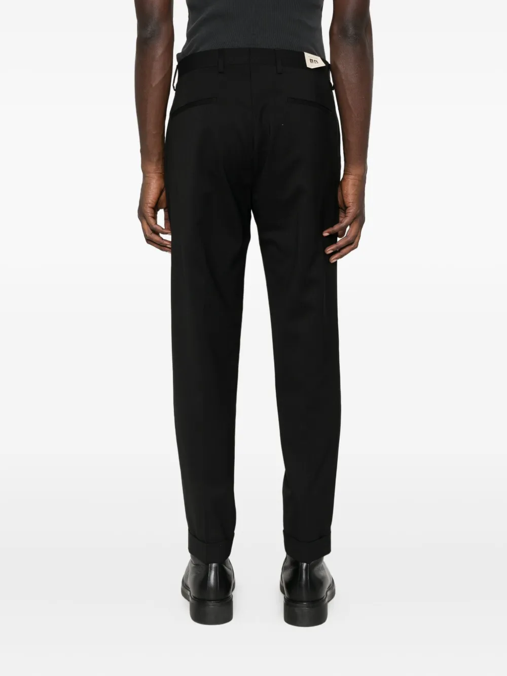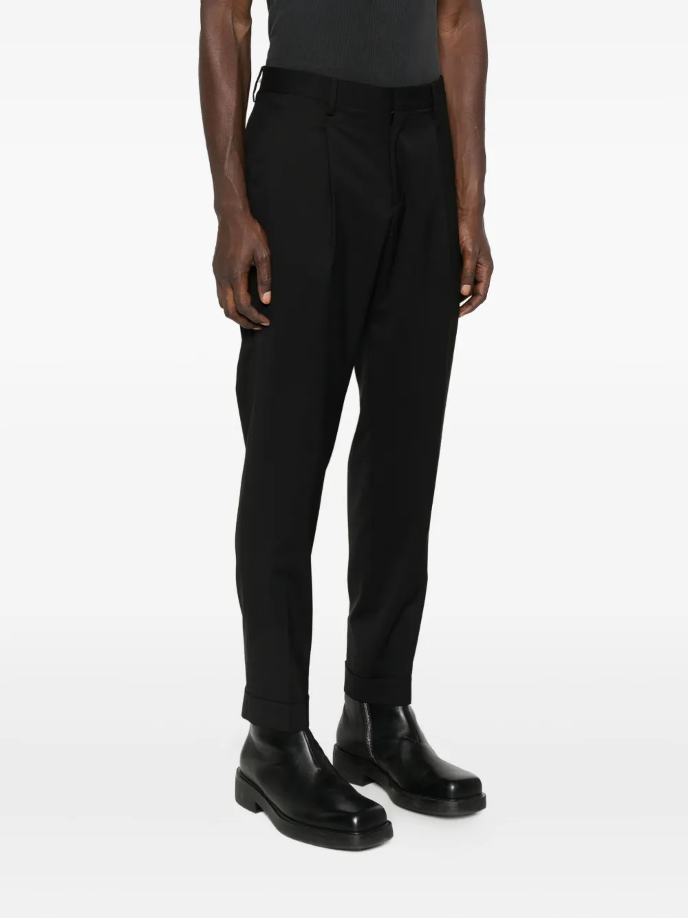 Черные брюки прямого кроя со складками на передней части, подворотами на манжетах, средней посадкой и застежкой на пуговицах.