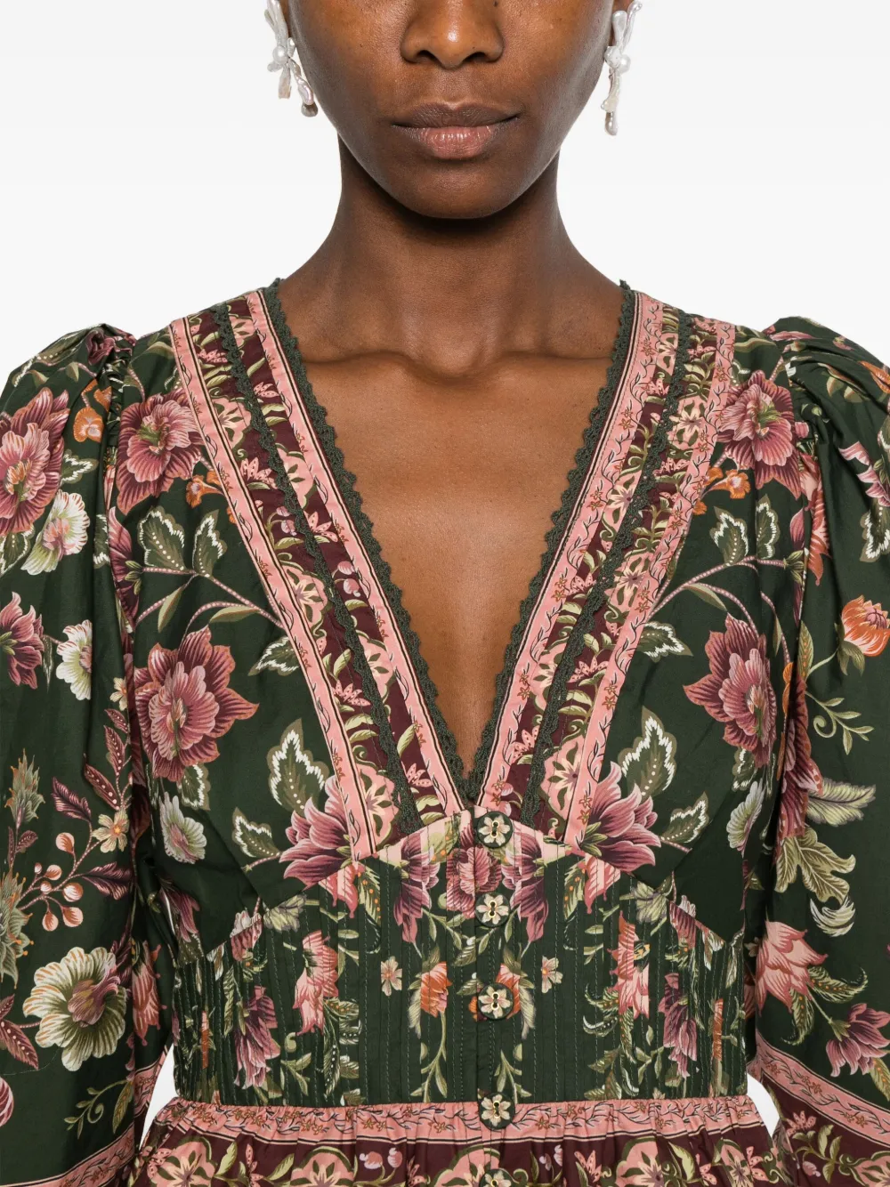 Темно-зеленый цветочный узор V-образный вырез рукава три четверти отделка кружевом застежка на пуговицы