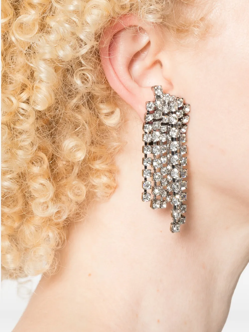 Серебристый оттенок, украшены кристаллами, линейный дизайн, несколько рядов, ниспадающие детали, застежка-клипса. Эти серьги идут в паре.