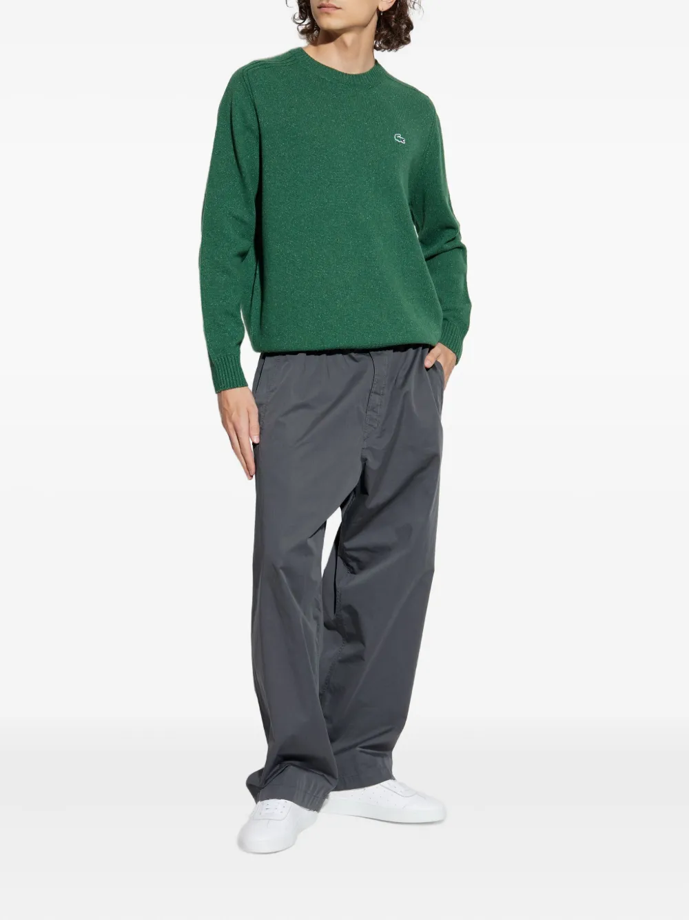 Зеленый шерстяной свитер с вышитым логотипом крокодила, рубчатыми манжетами и подолом, круглый вырез