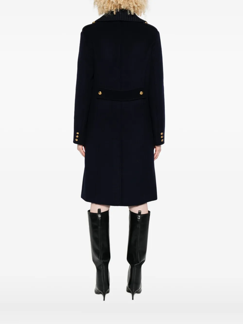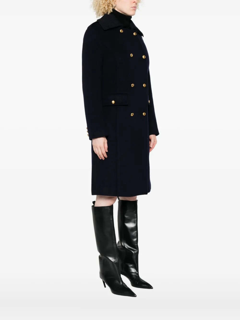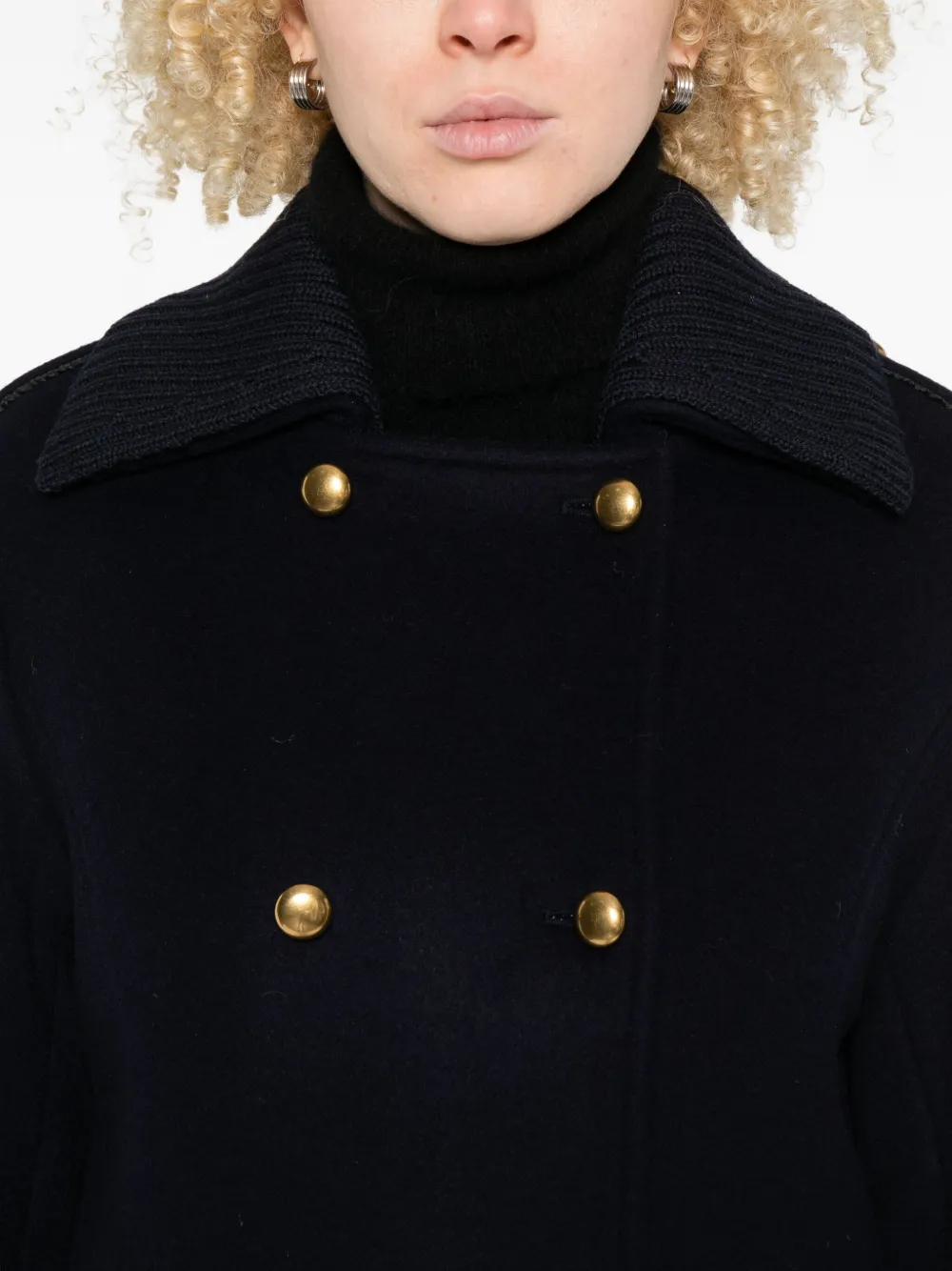 Темно-синий цвет, рубчатый воротник, двубортная застежка, накладные карманы с клапанами, прямой подол