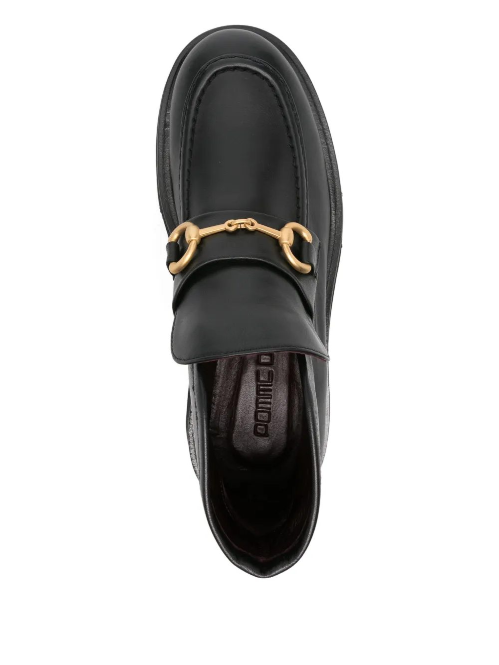 Верх из черной кожи, декоративная пряжка в виде золотистого конского хомутика, модель без застежки, круглый носок
