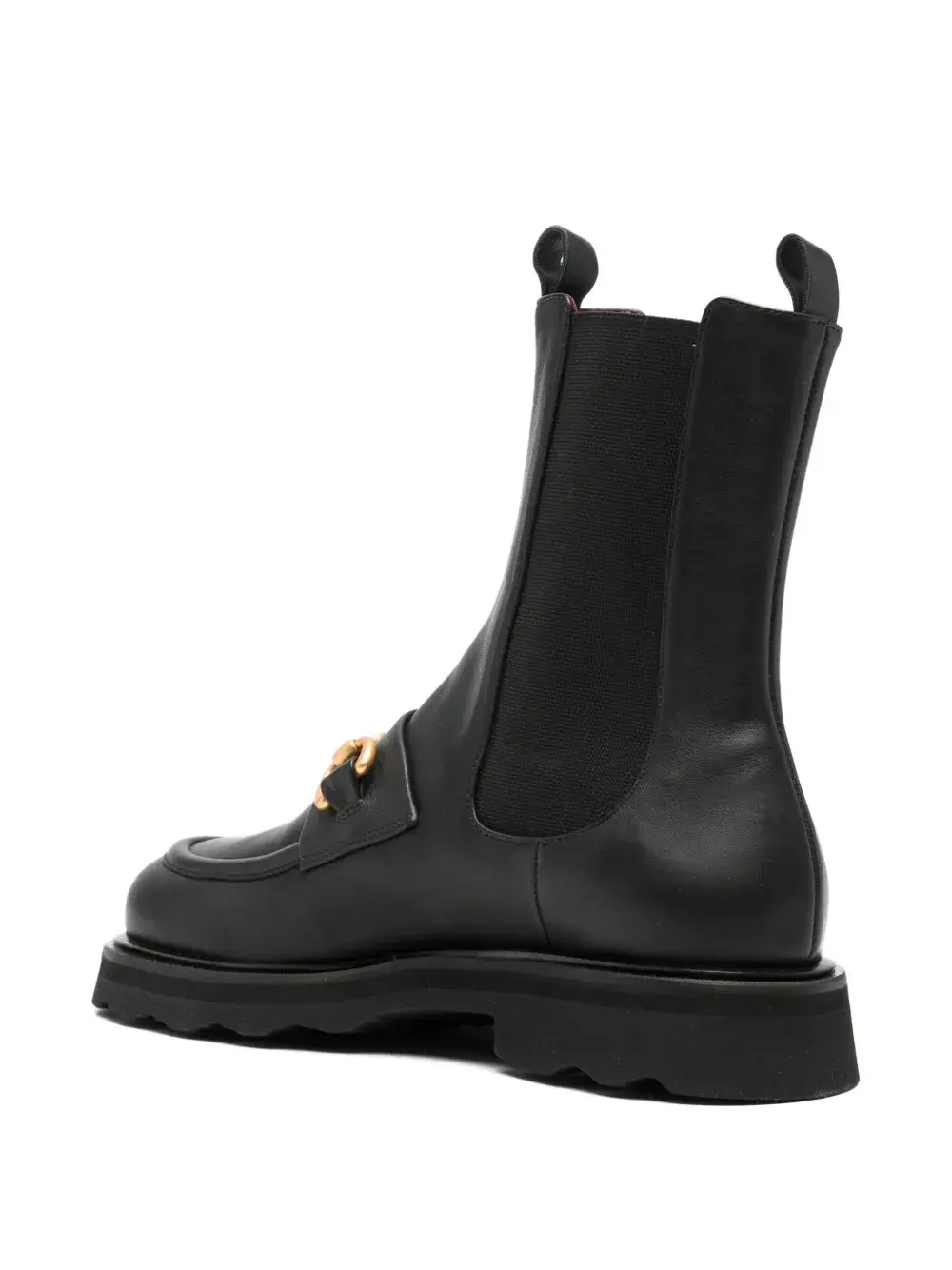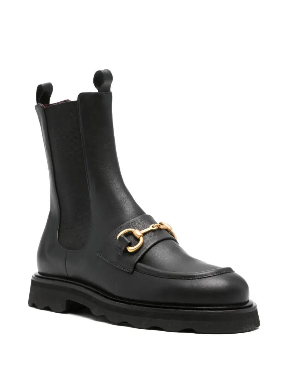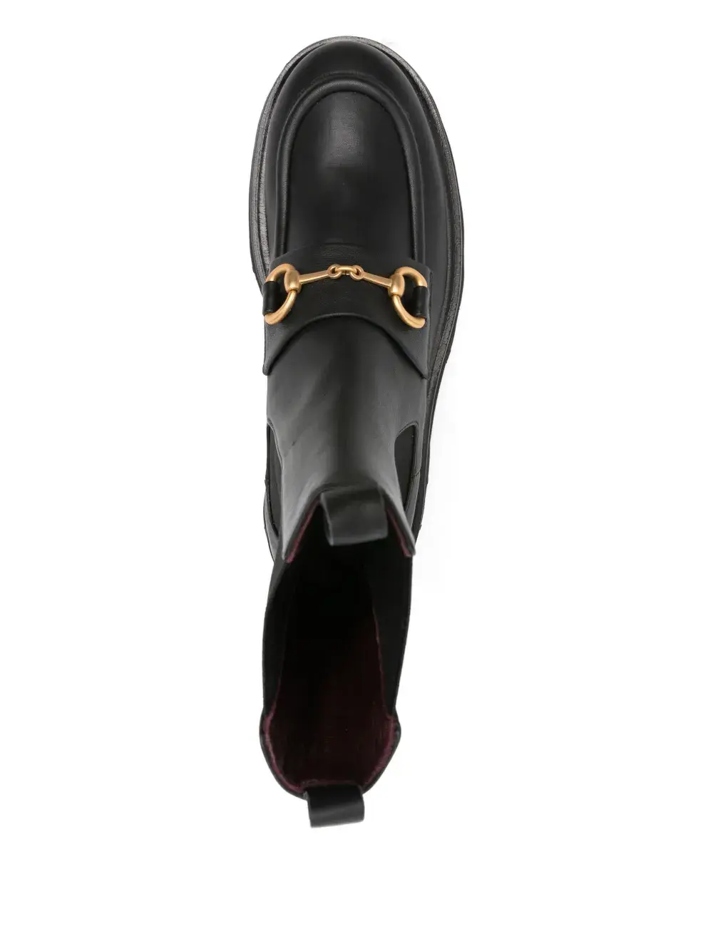 Верх из черной кожи, эластичные боковые вставки, декоративная деталь в виде упряжи, круглый носок, массивная подошва