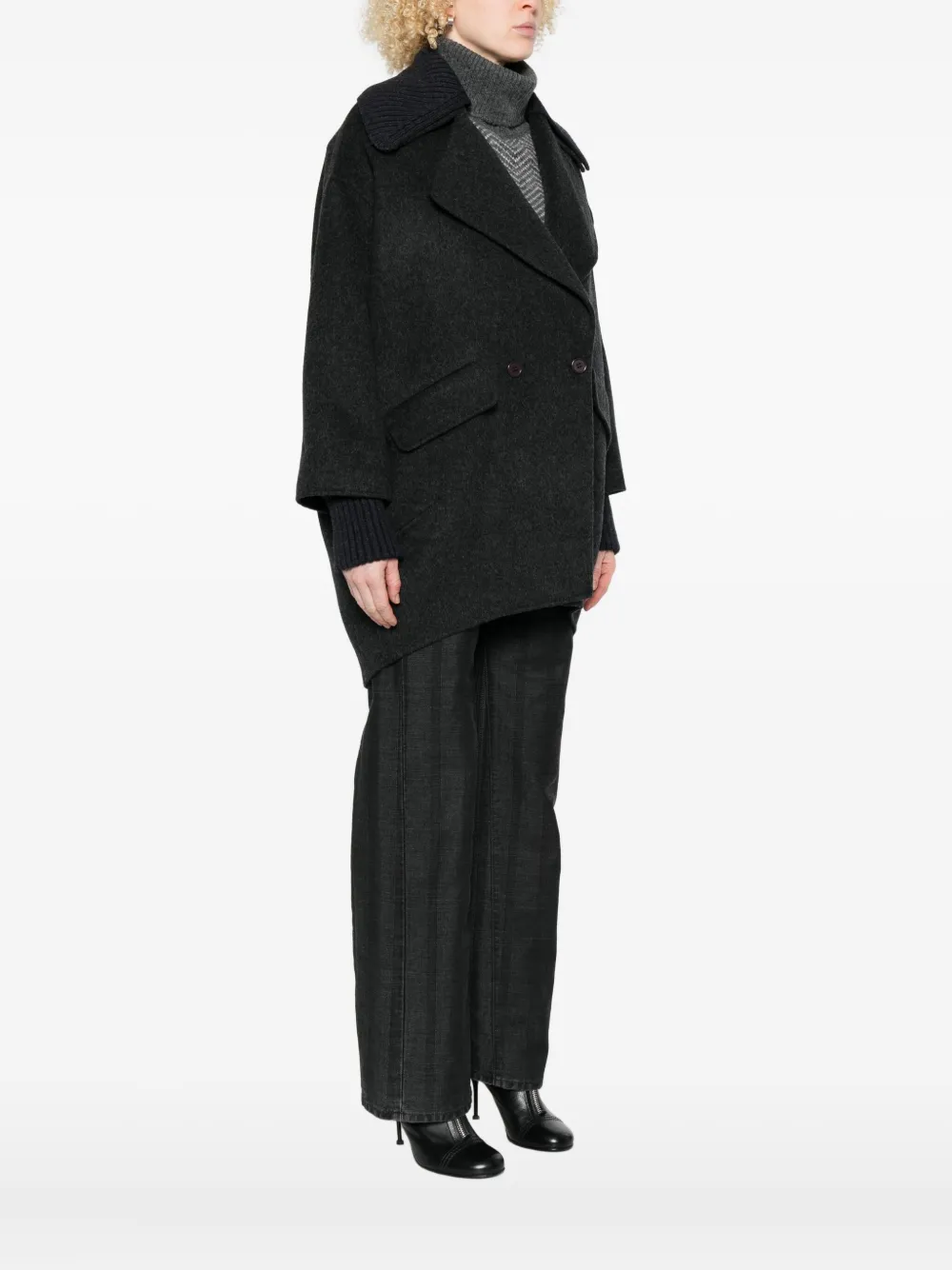 Темно-серый, двубортная застежка, клапанные карманы, манжеты в рубчик, широкий лацкан с вырезом