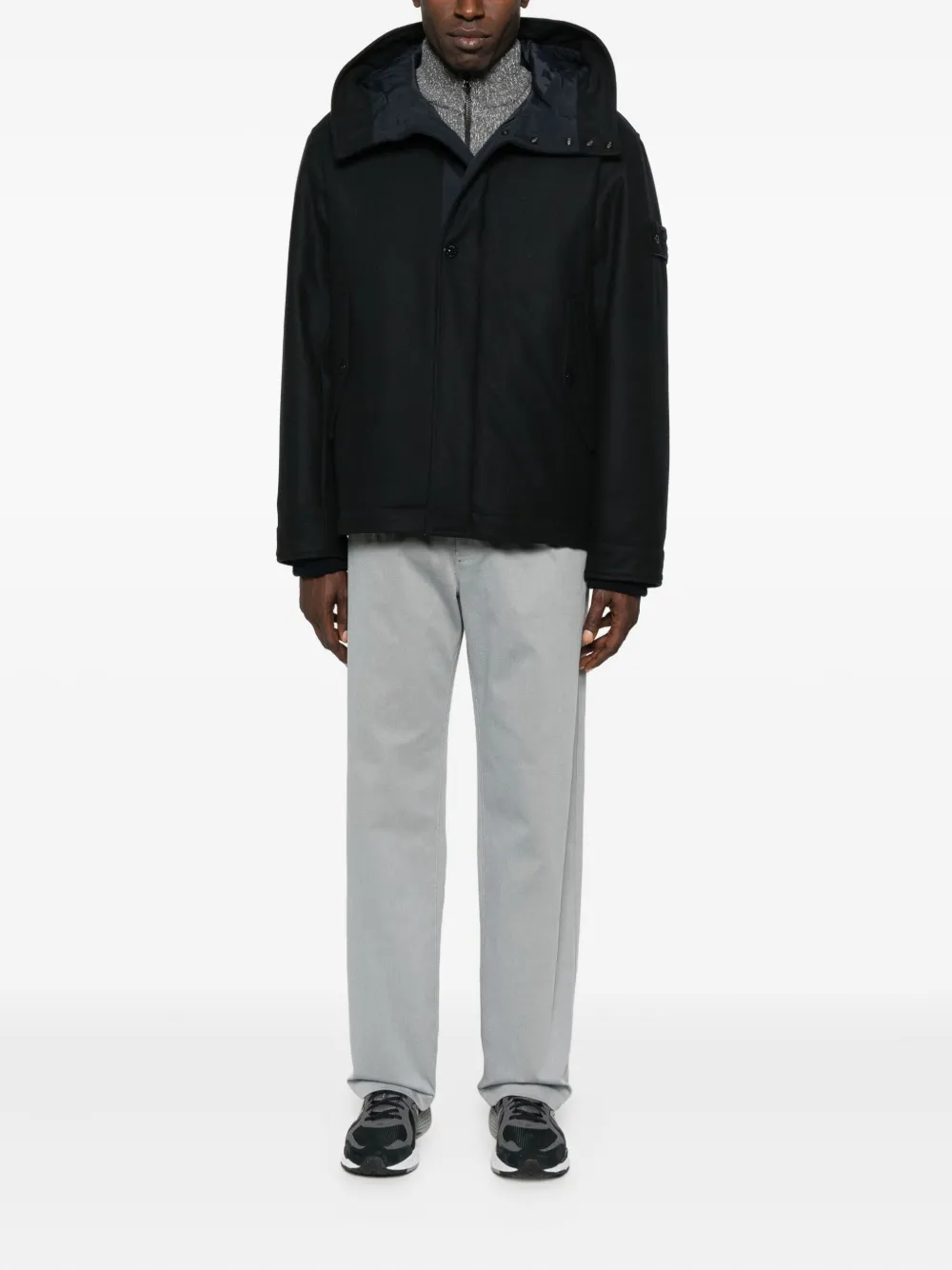 Темно-синий с капюшоном, застежка на пуговицы, накладные карманы с клапанами, стеганая подкладка