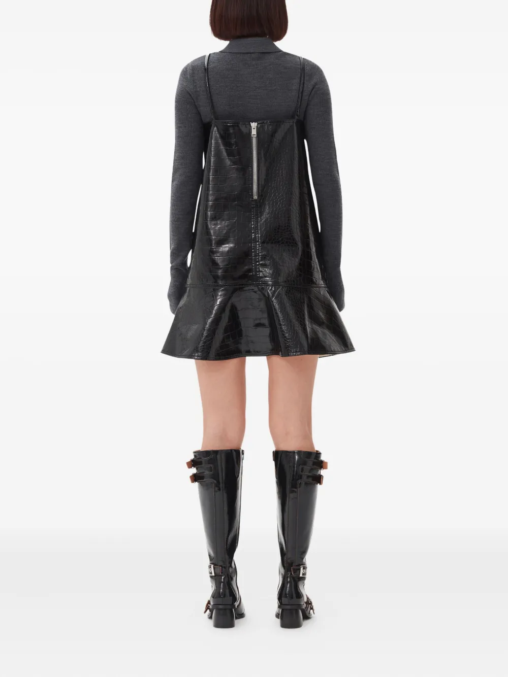 Мини-платье клеш с эффектом кожи крокодила GANNI, черный