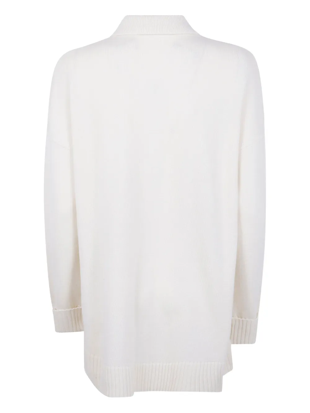 Белый цвет, рубчатый подол, воротник, застежка на пуговицы, накладной карман, длинные рукава