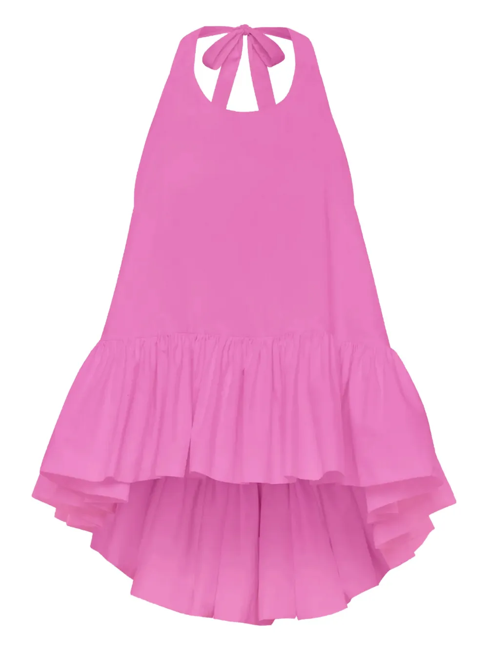 Розовое платье с ярусными воланами, асимметричным подолом и завязками