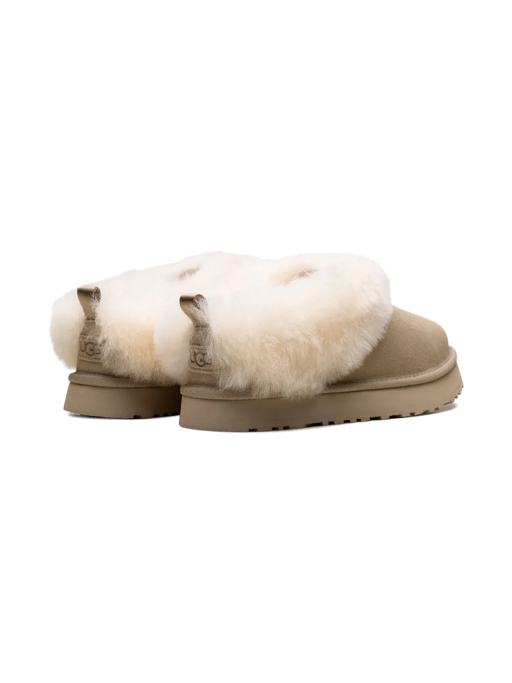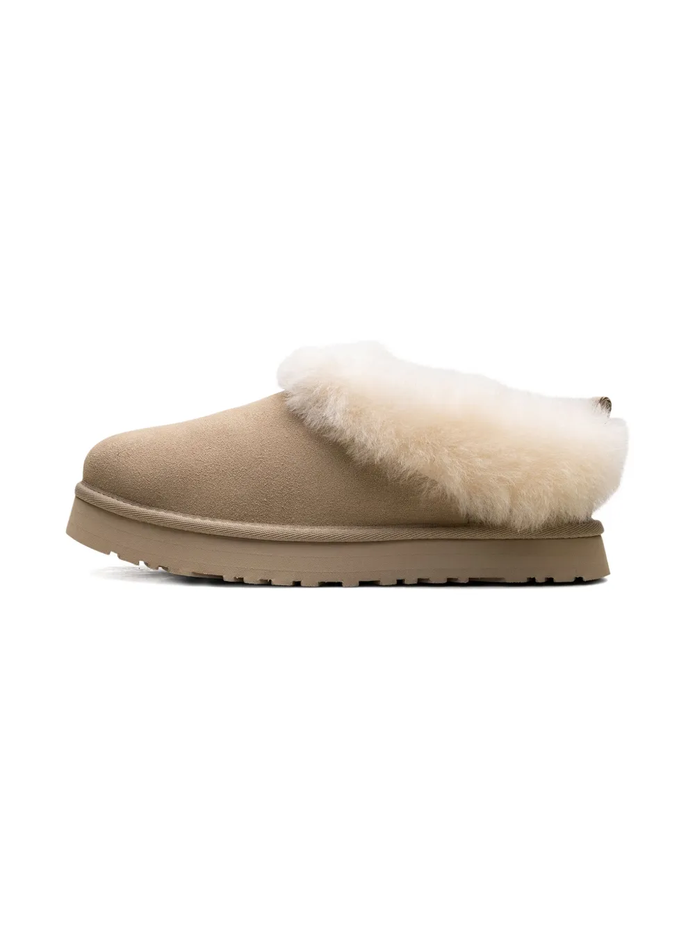 Верх из бежевой замши, отделка мехом, модель без застежки, плоская подошва, резиновая подошва