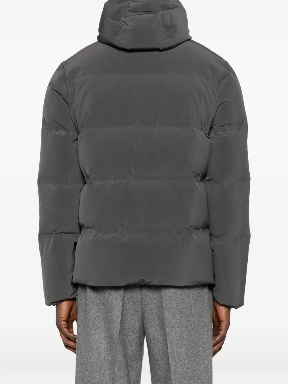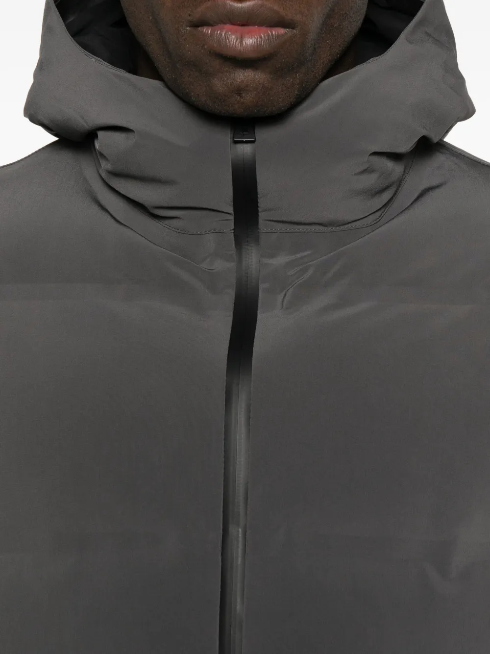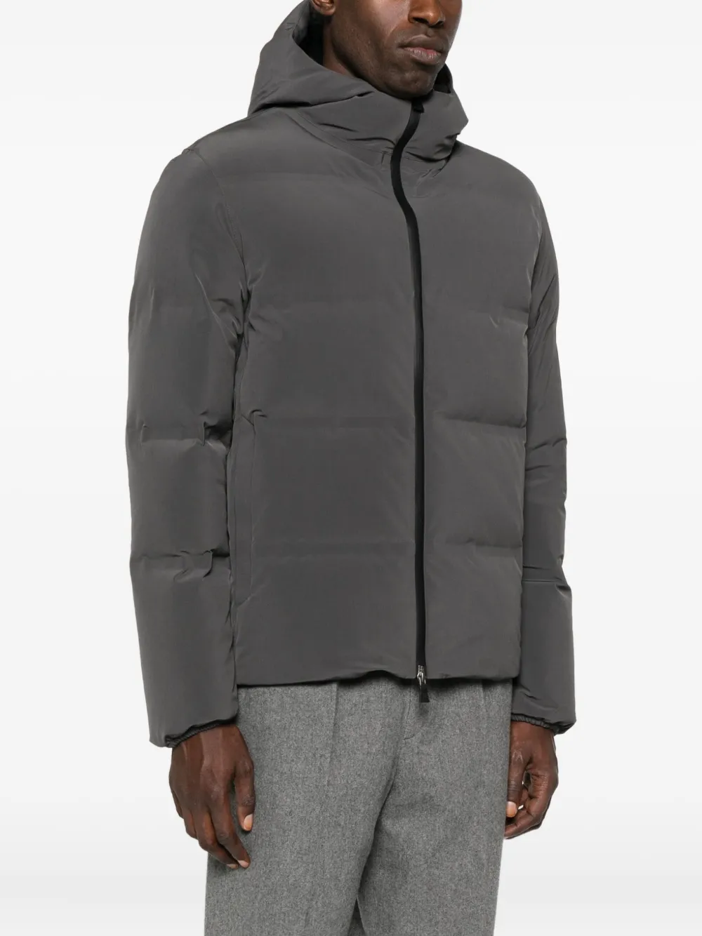 Темно-серый цвет, стеганый дизайн, капюшон, застежка на молнии, длинные рукава, эластичные манжеты