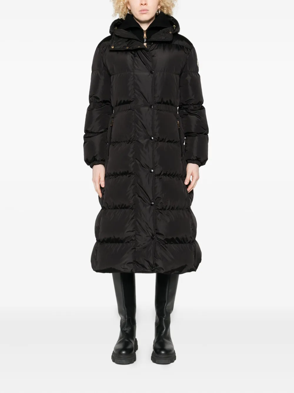 Черныйстеганый дизайнкапюшонзастежка на молнию и пуговицыдлинные рукавакарманы на молнии