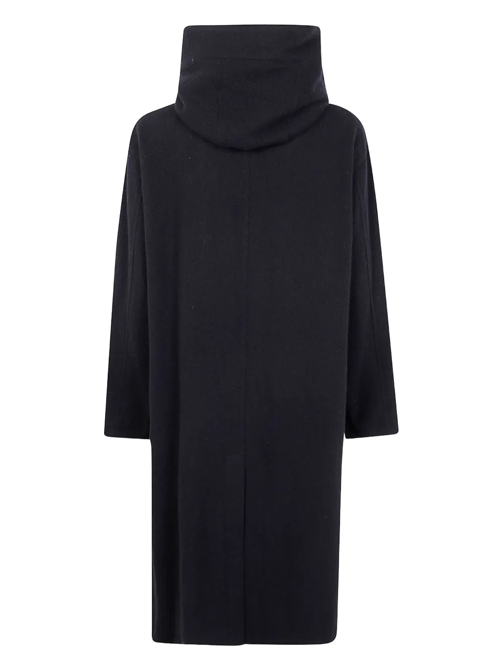 Черный цвет, капюшон, скрытая застежка спереди, заниженная линия плеч, длинные рукава, прорезные карманы