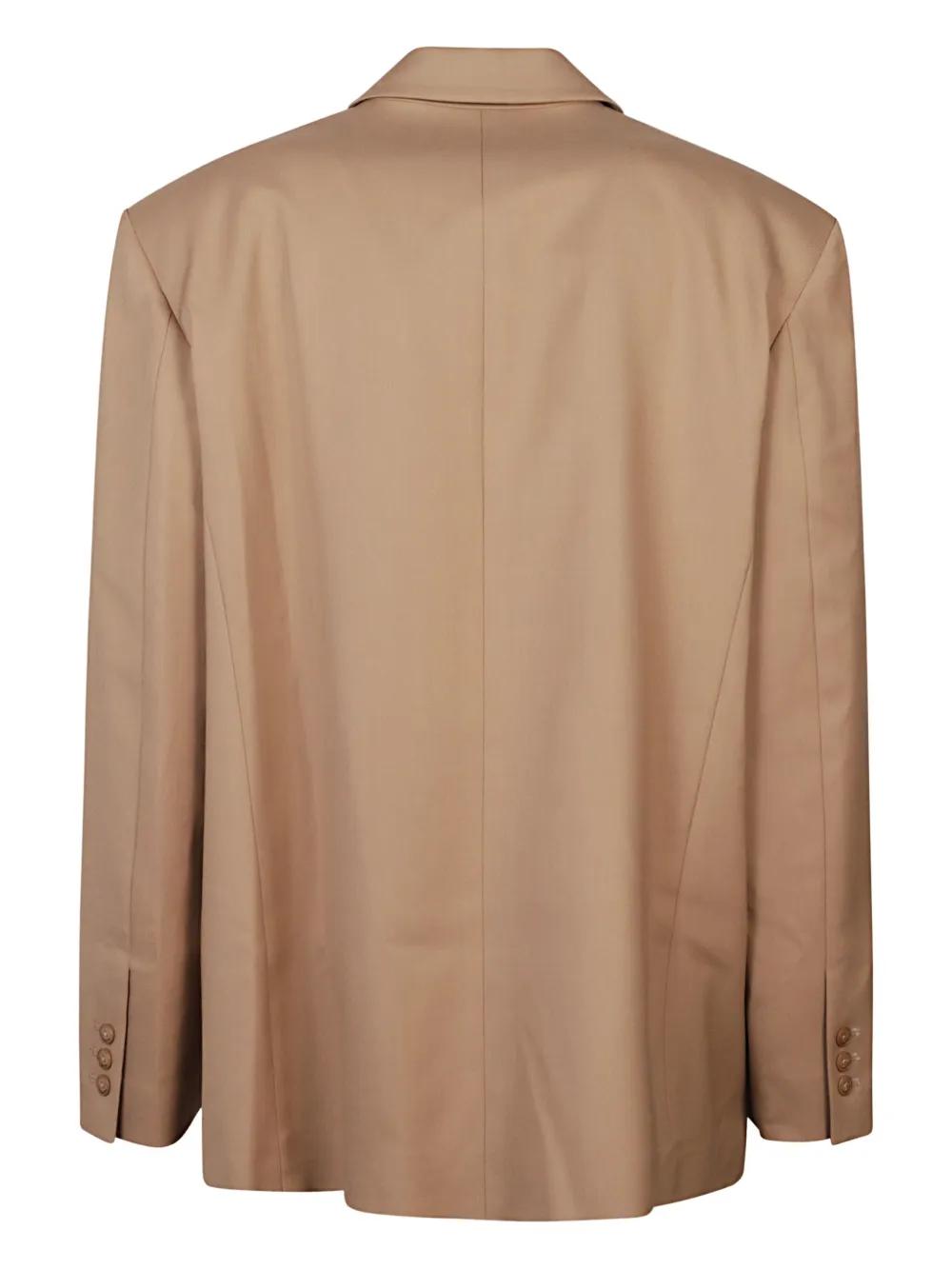 Бежевый жакет с запахом, застежкой на две пуговицы, прорезными карманами, длинными рукавами и прямым подолом