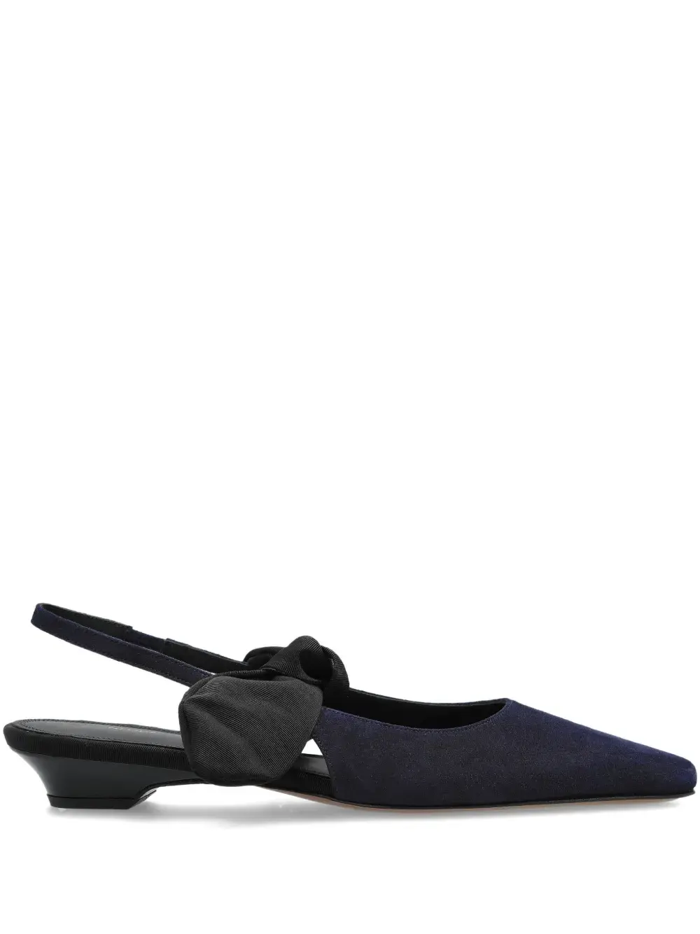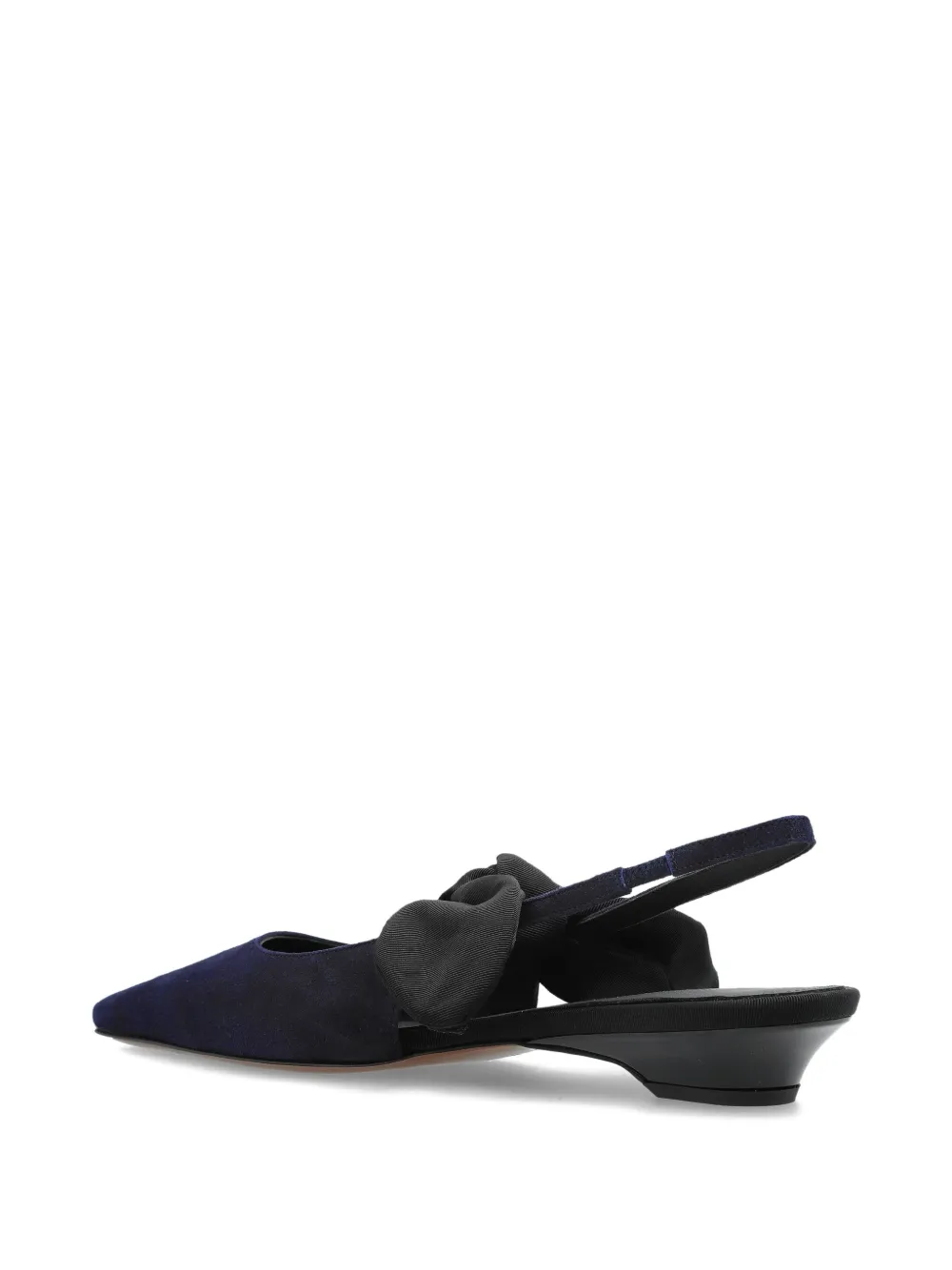 Темно-синий верх из замши, ремешок на пятке, бант из репсовой ленты, заостренный носок, низкий каблук