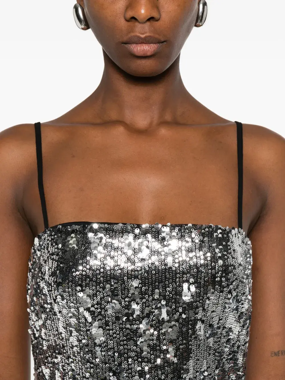 Серебристый оттенок декор из пайеток тонкие бретели квадратный вырез без рукавов прямой подол