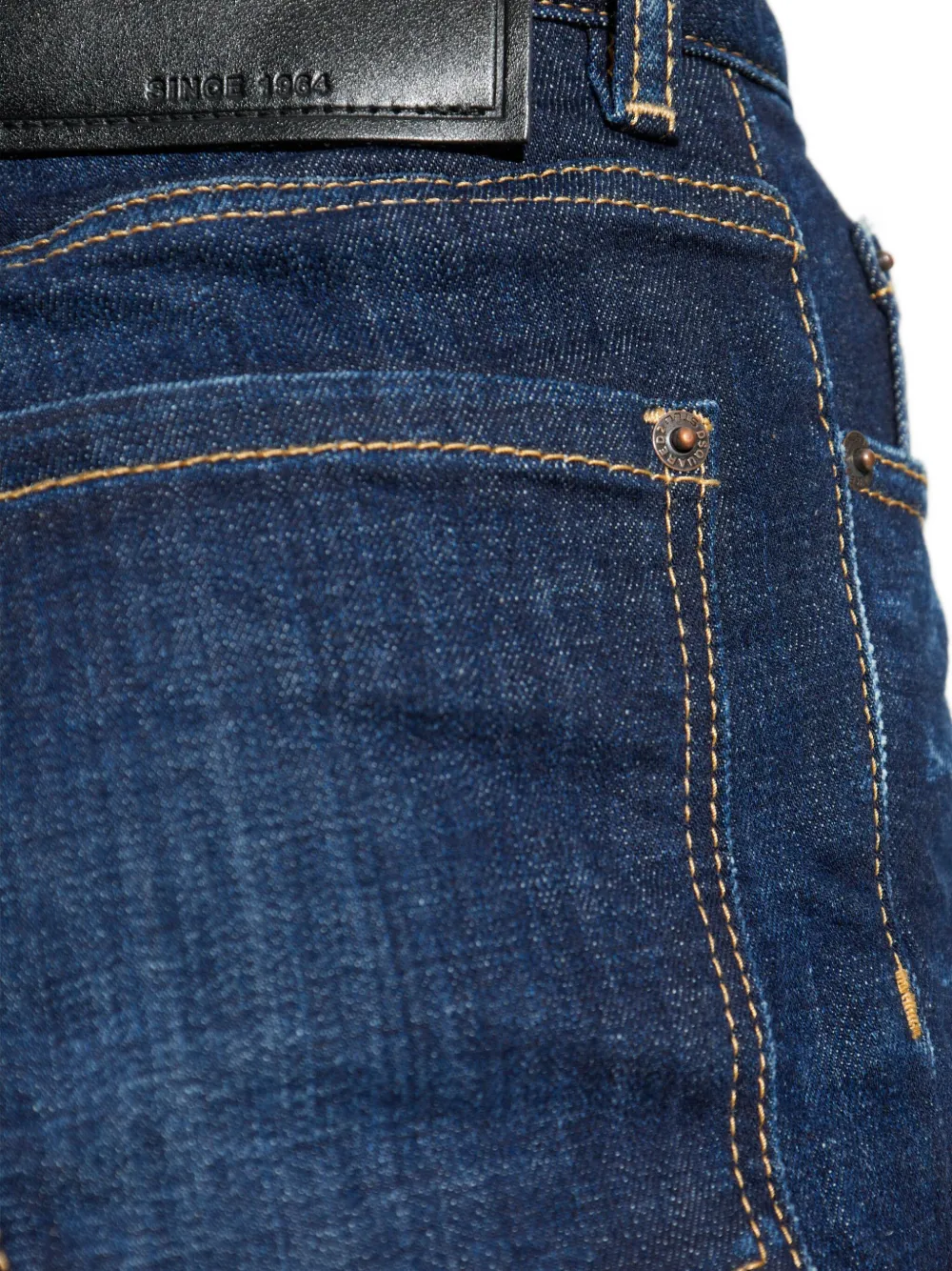 Темно-синий, золотистая строчка, кожаная нашивка с логотипом, застежка на пуговицу, пять карманов