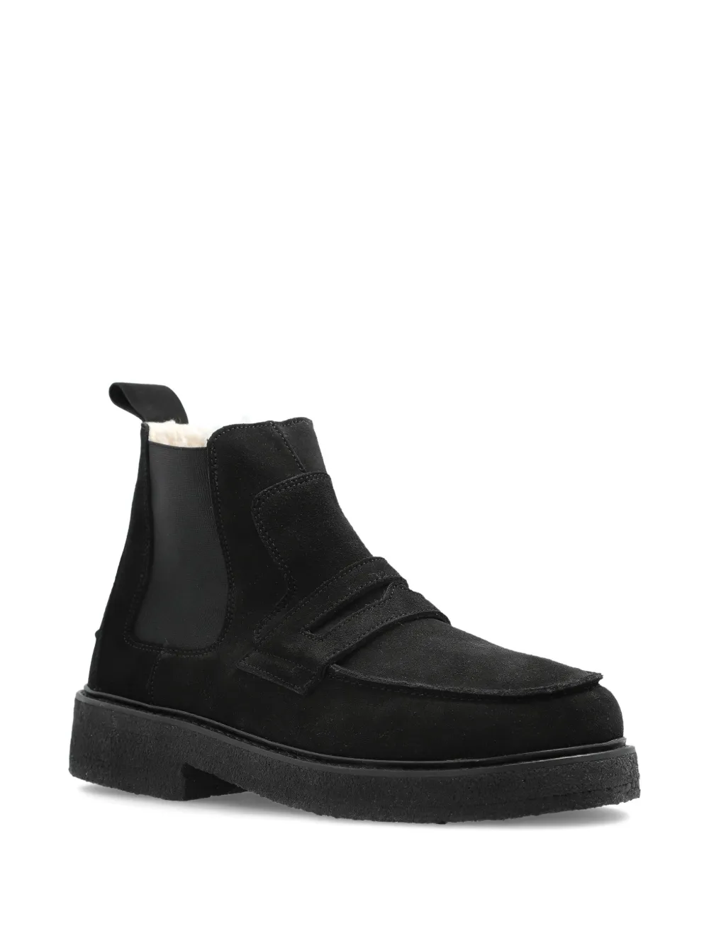 Черныйверхий слой из замшиподкладка из овчиныэластичная боковая вставкакруглый носокплоская подошва