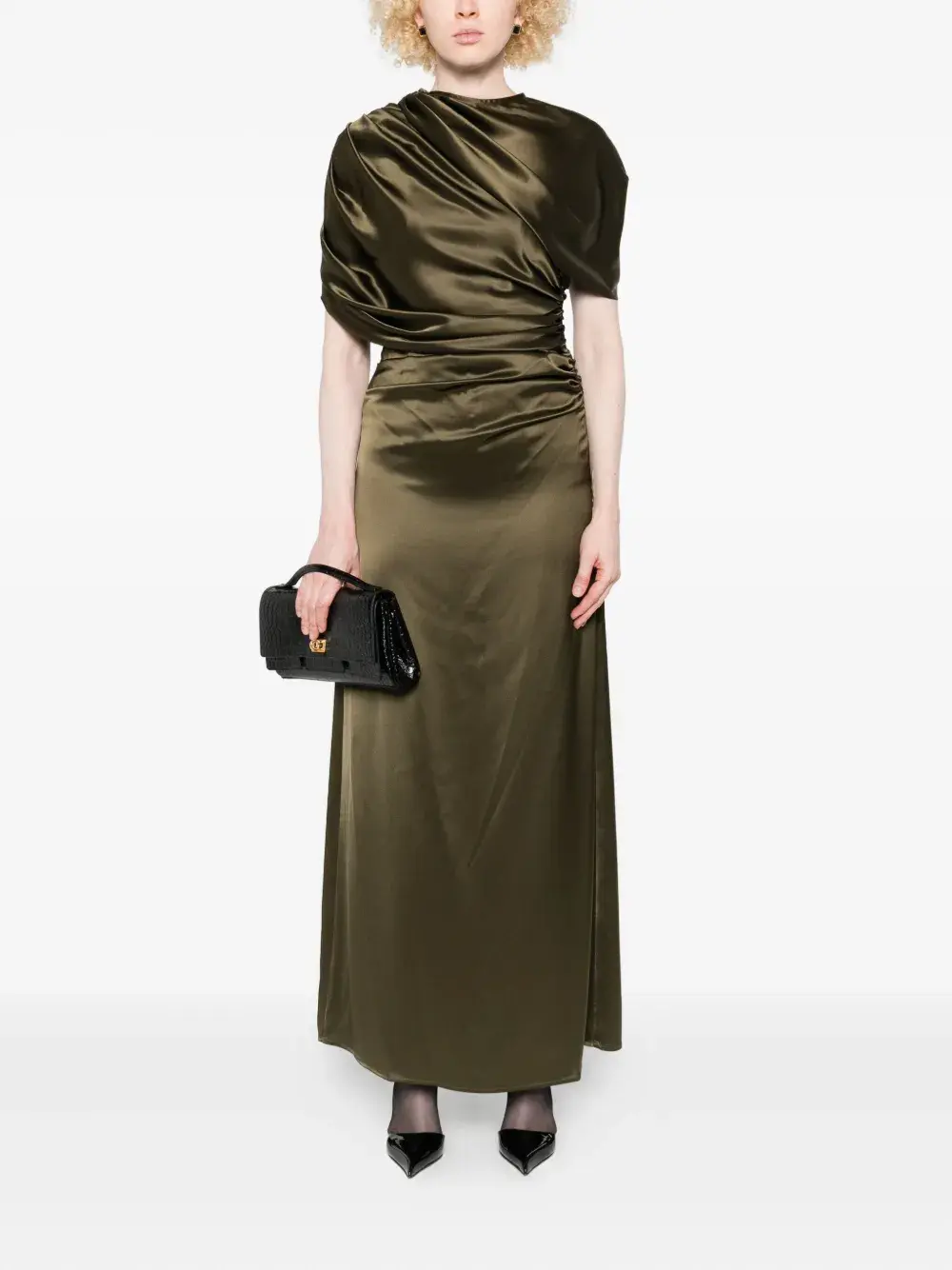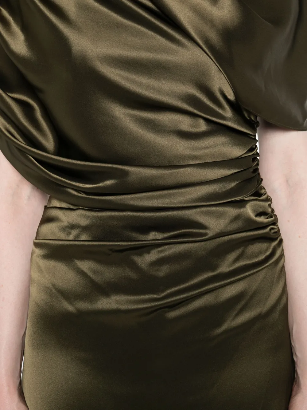 Оливково-зеленая атласная ткань, драпировка, сборки, юбка в пол