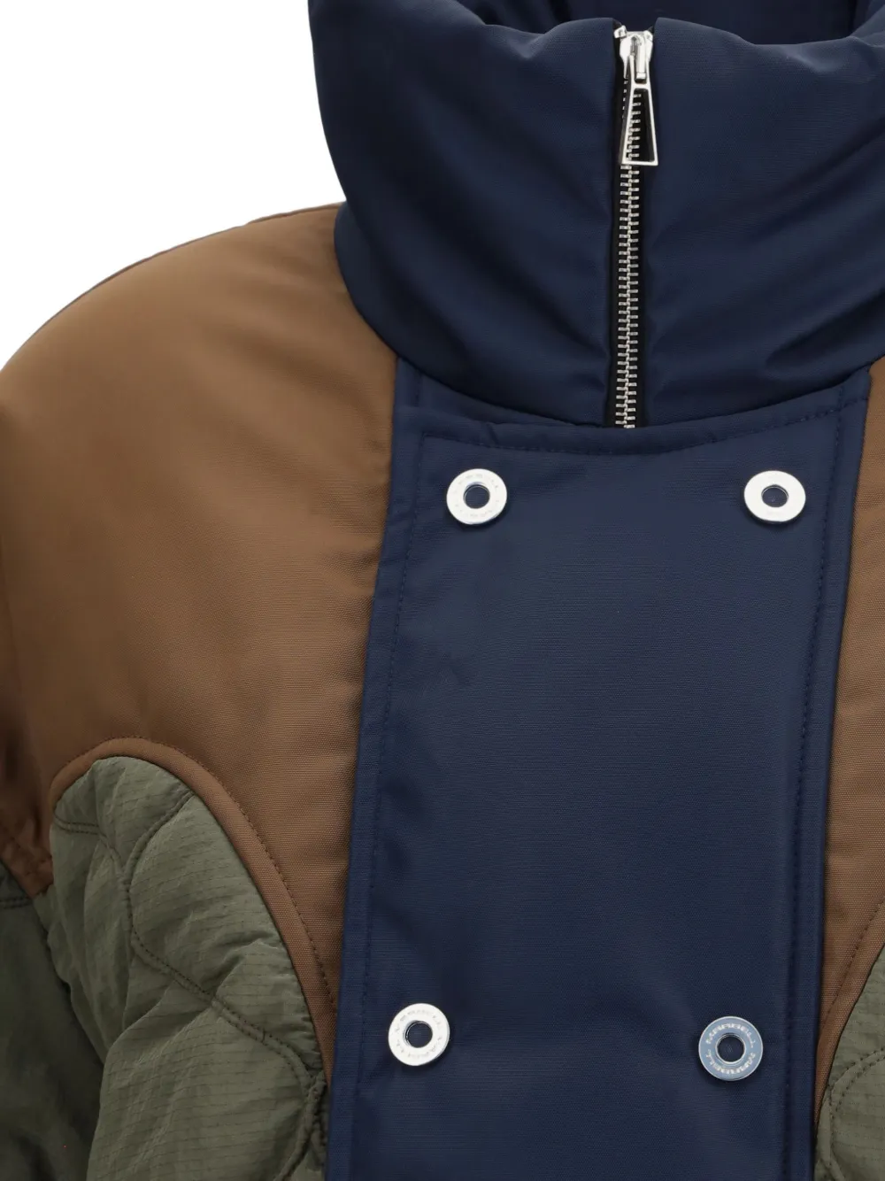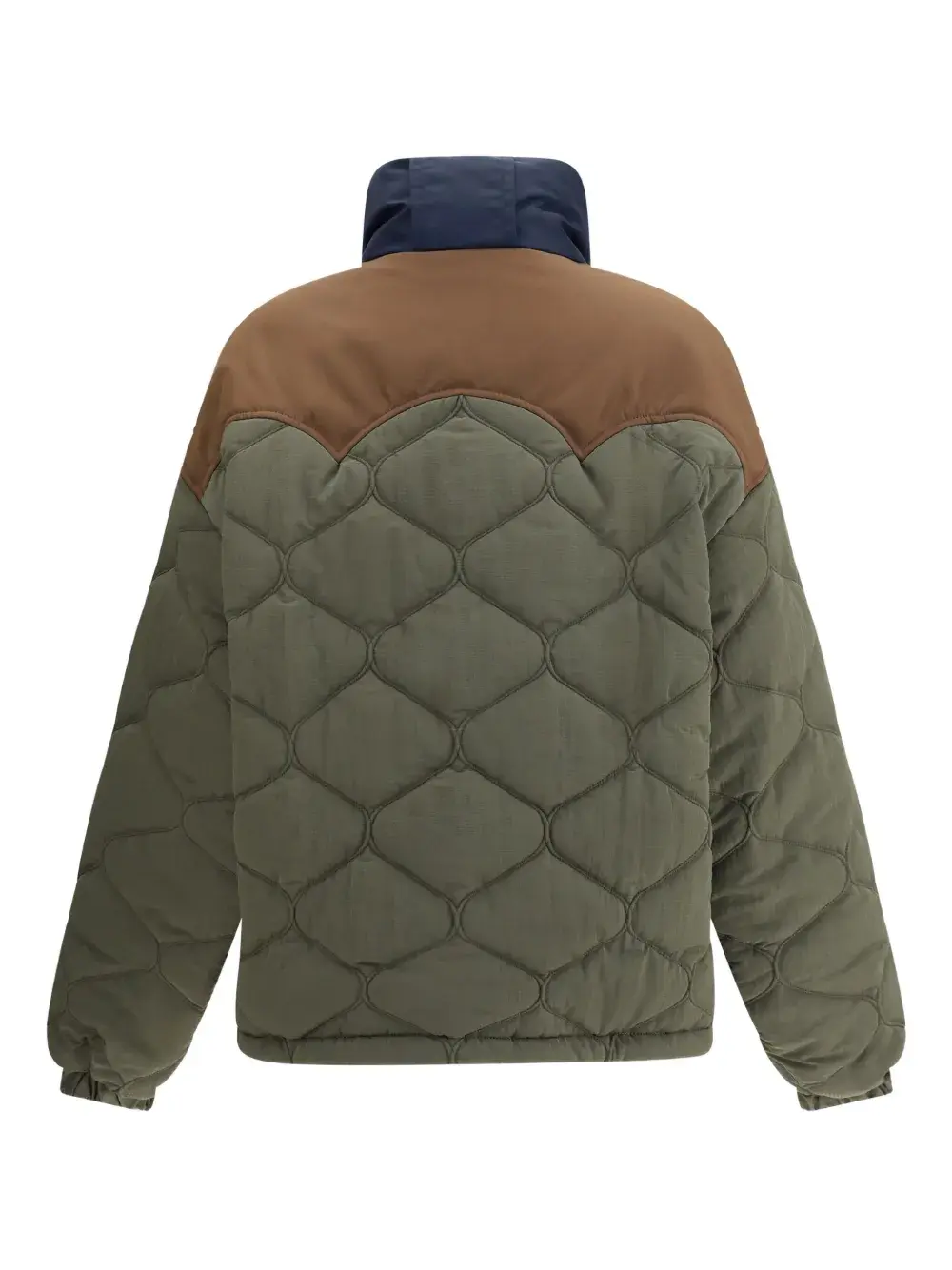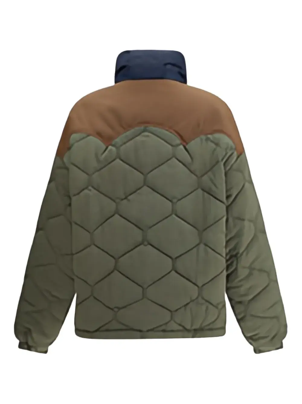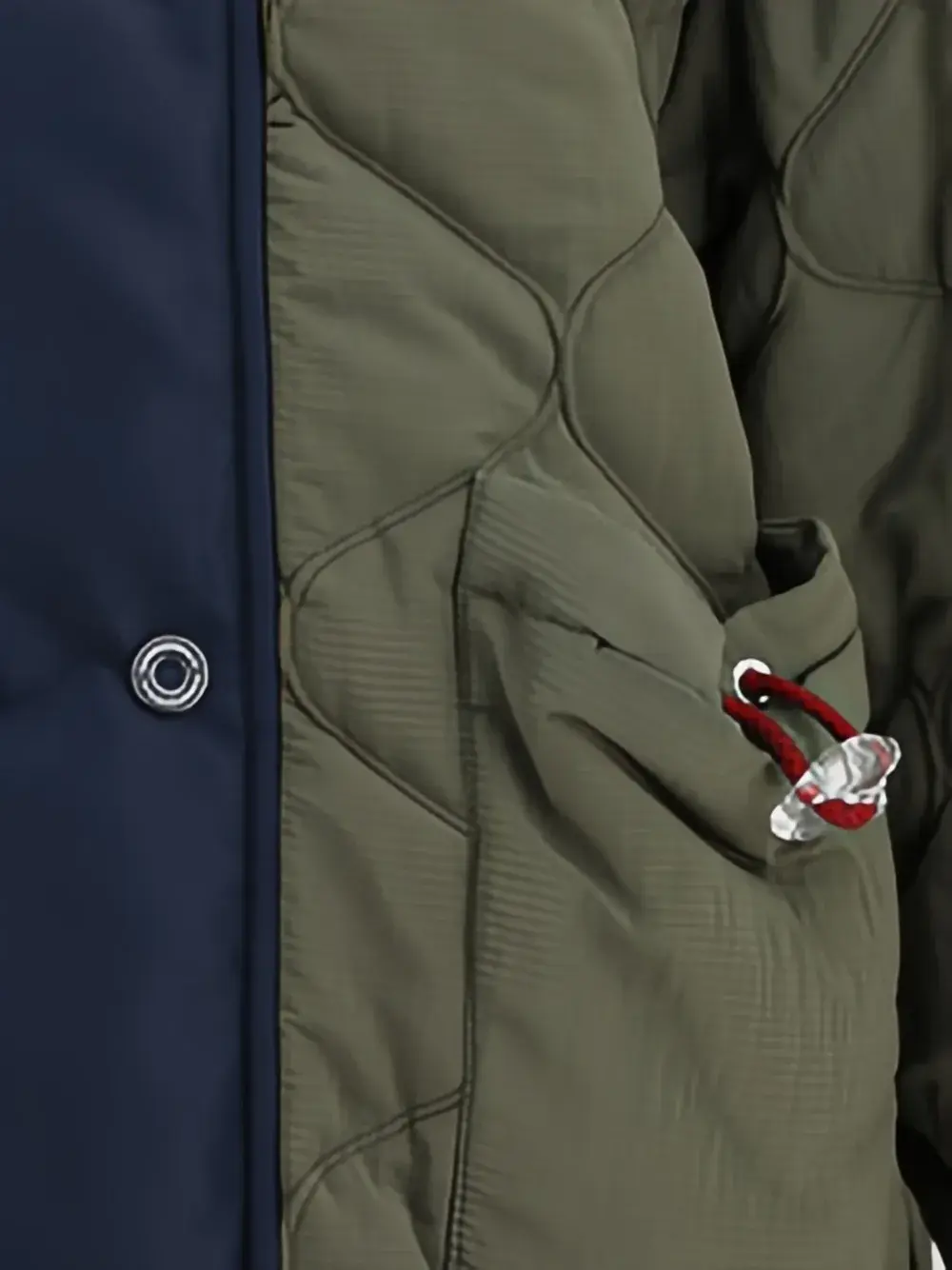Оливково-зеленый стеганый узор "ромбы" вставки темно-синего цвета вставки коричневого цвета застежка на двубортные пуговицы карманы с отделкой на кулиске