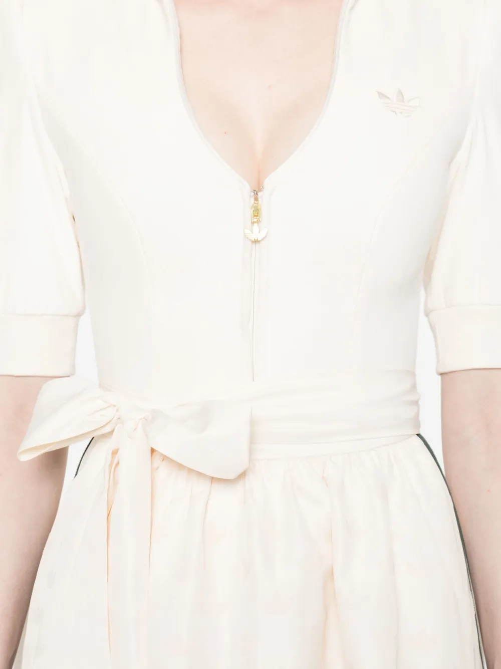 Молочно-белый цвет, застежка-молния спереди, отделка в виде трех полос, короткие рукава, завязывающиеся ленты