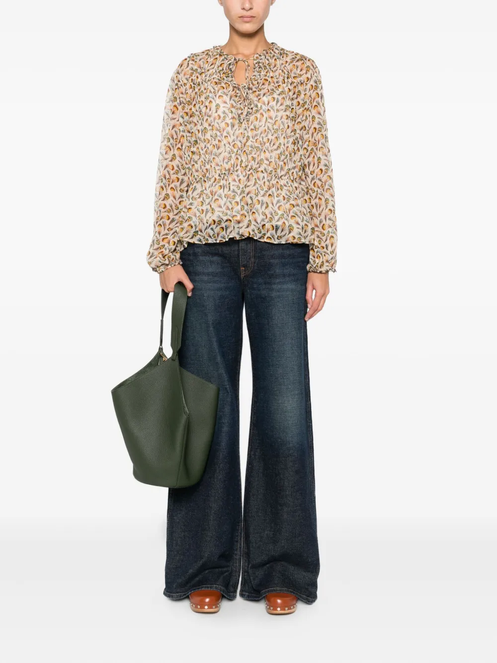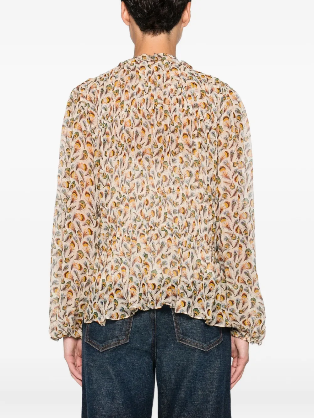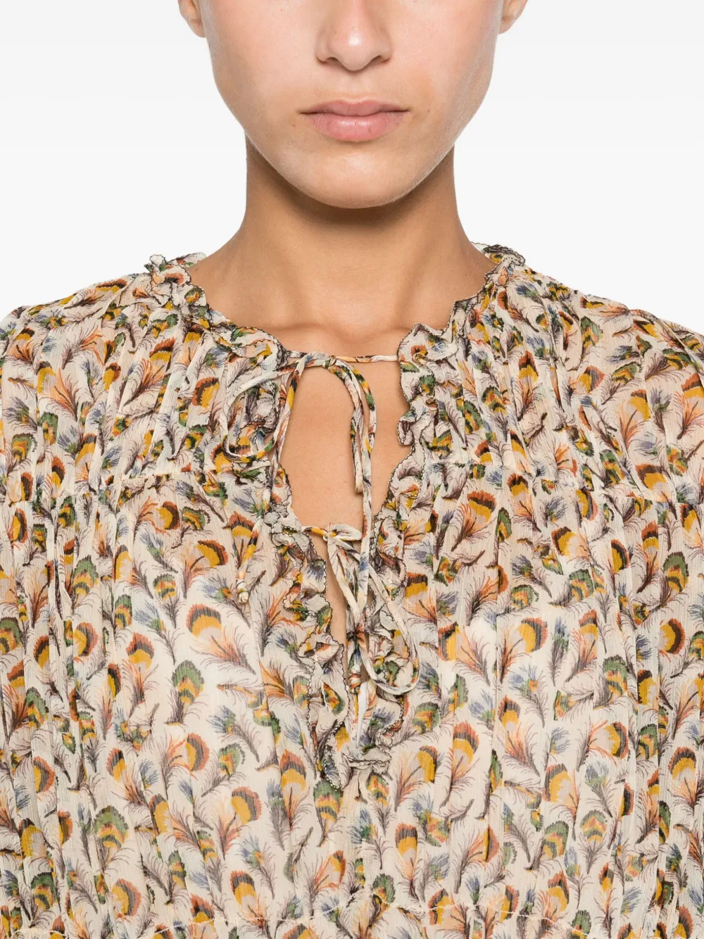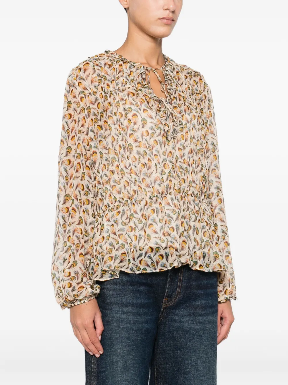 Цвет: экрю цветочный принт оборчатый вырез длинные рукава застежка на завязках