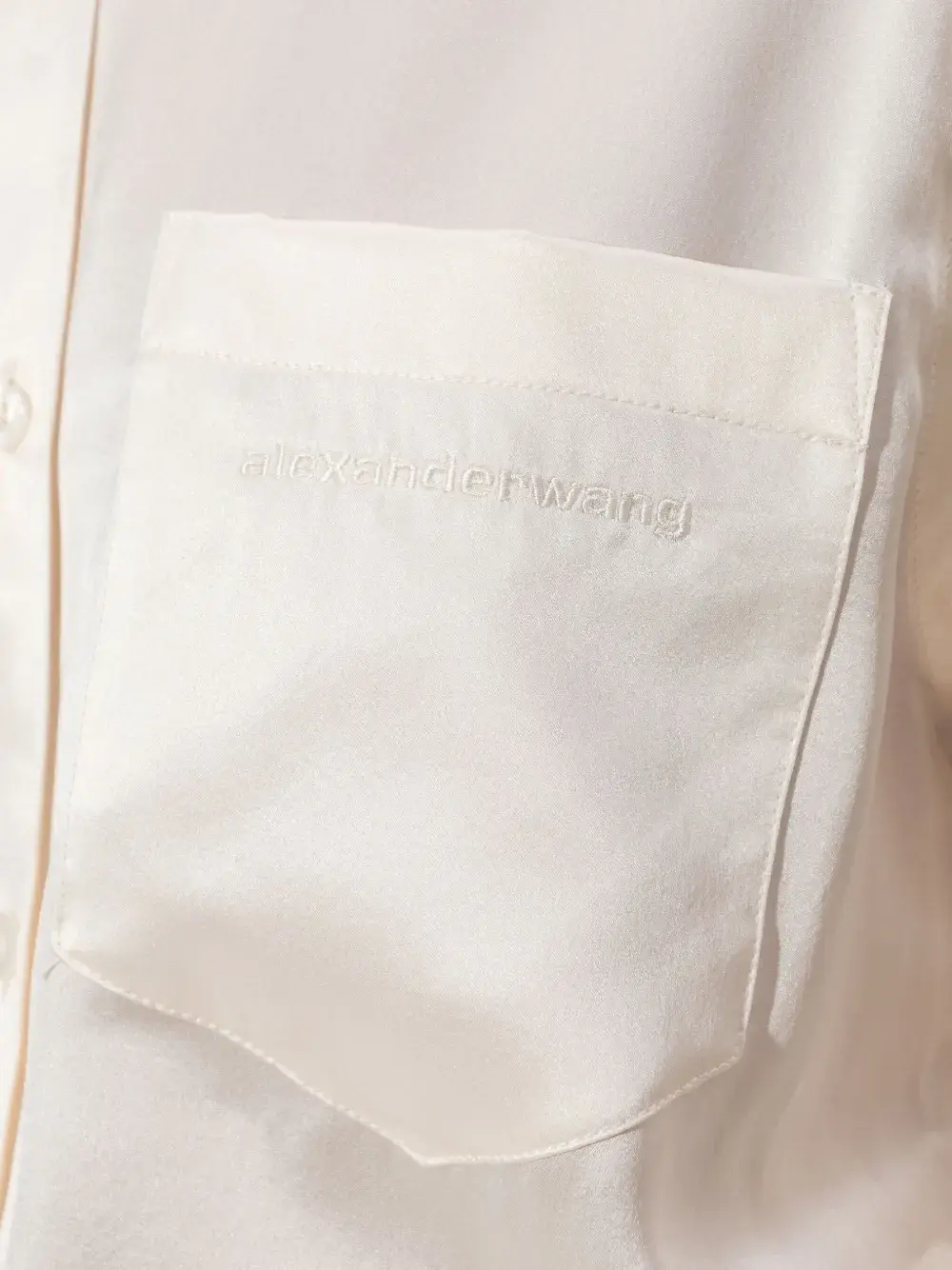 Белый шелк застежка на пуговицы спереди оборчатый асимметричный подол длинные рукава нагрудный накладной карман