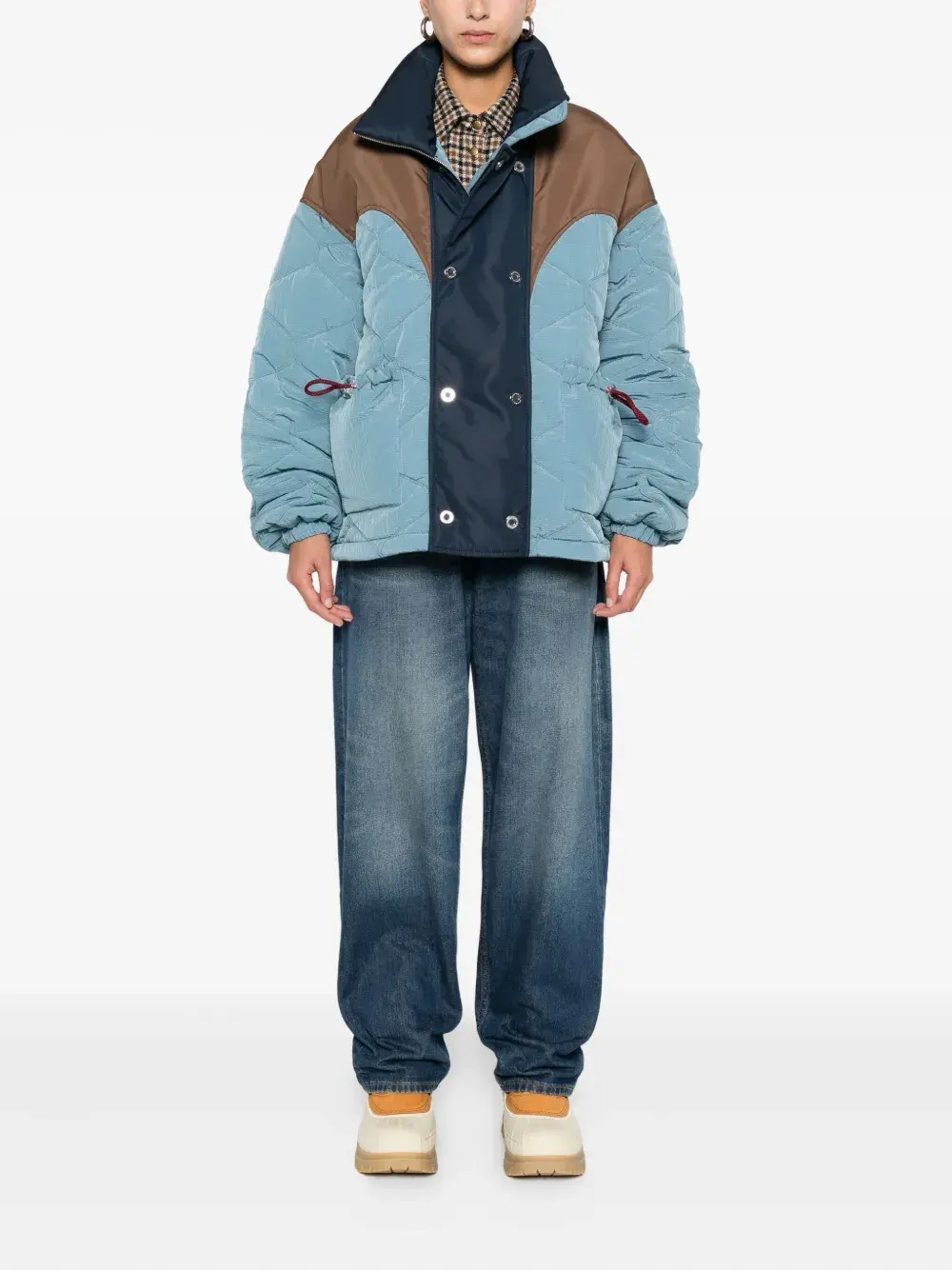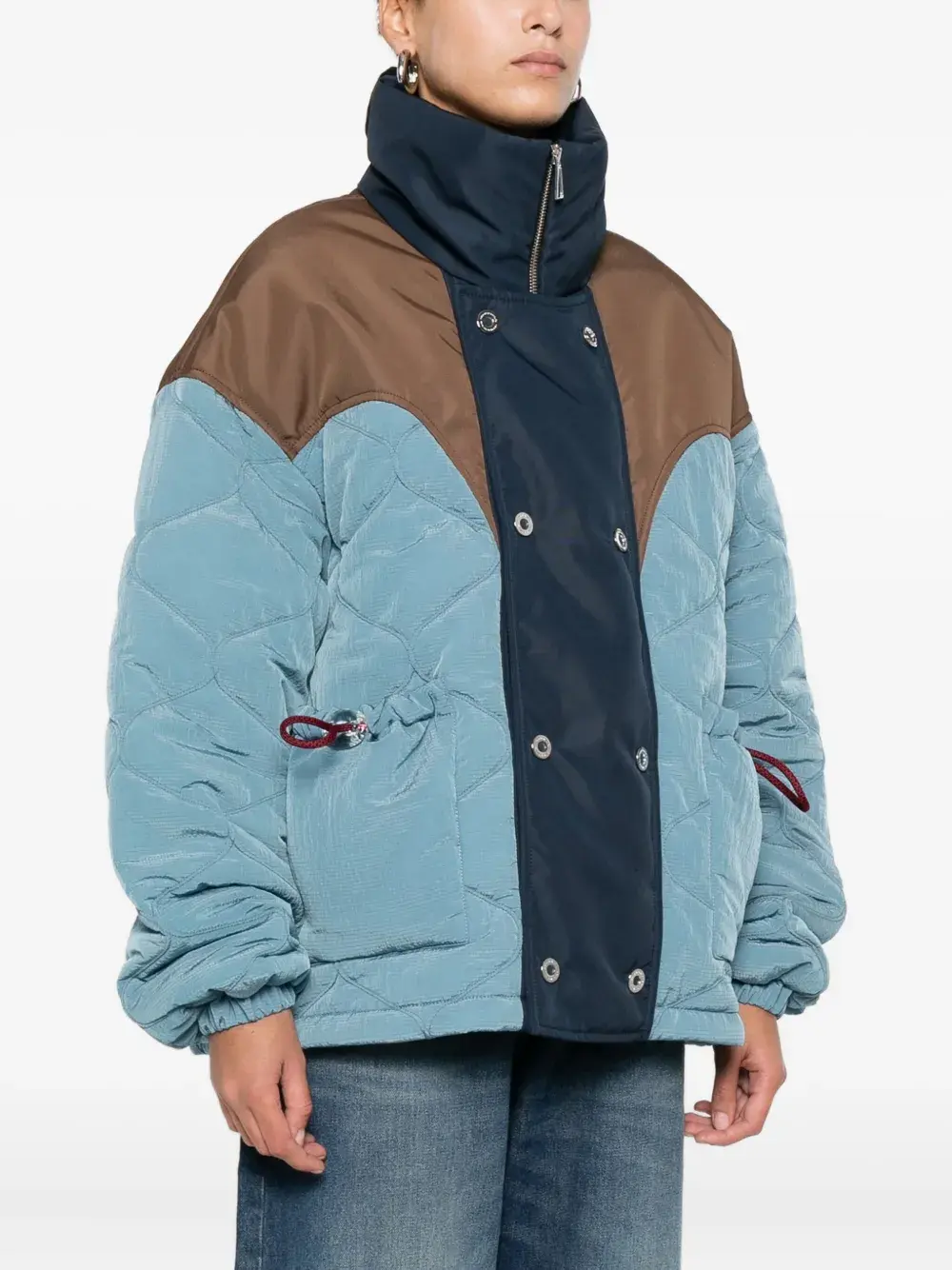 Светло-голубой стеганый дизайн конструкция с панелями застежка на кнопки и молнию накладные карманы спереди высокий воротник
