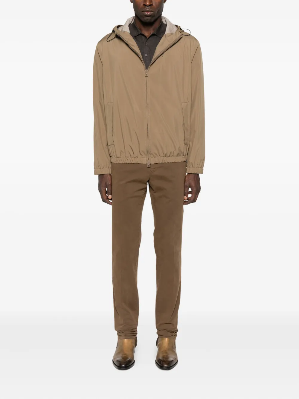 Бежевый капюшон со шнурком застежка-молния спереди боковые прорезные карманы эластичный нижний край