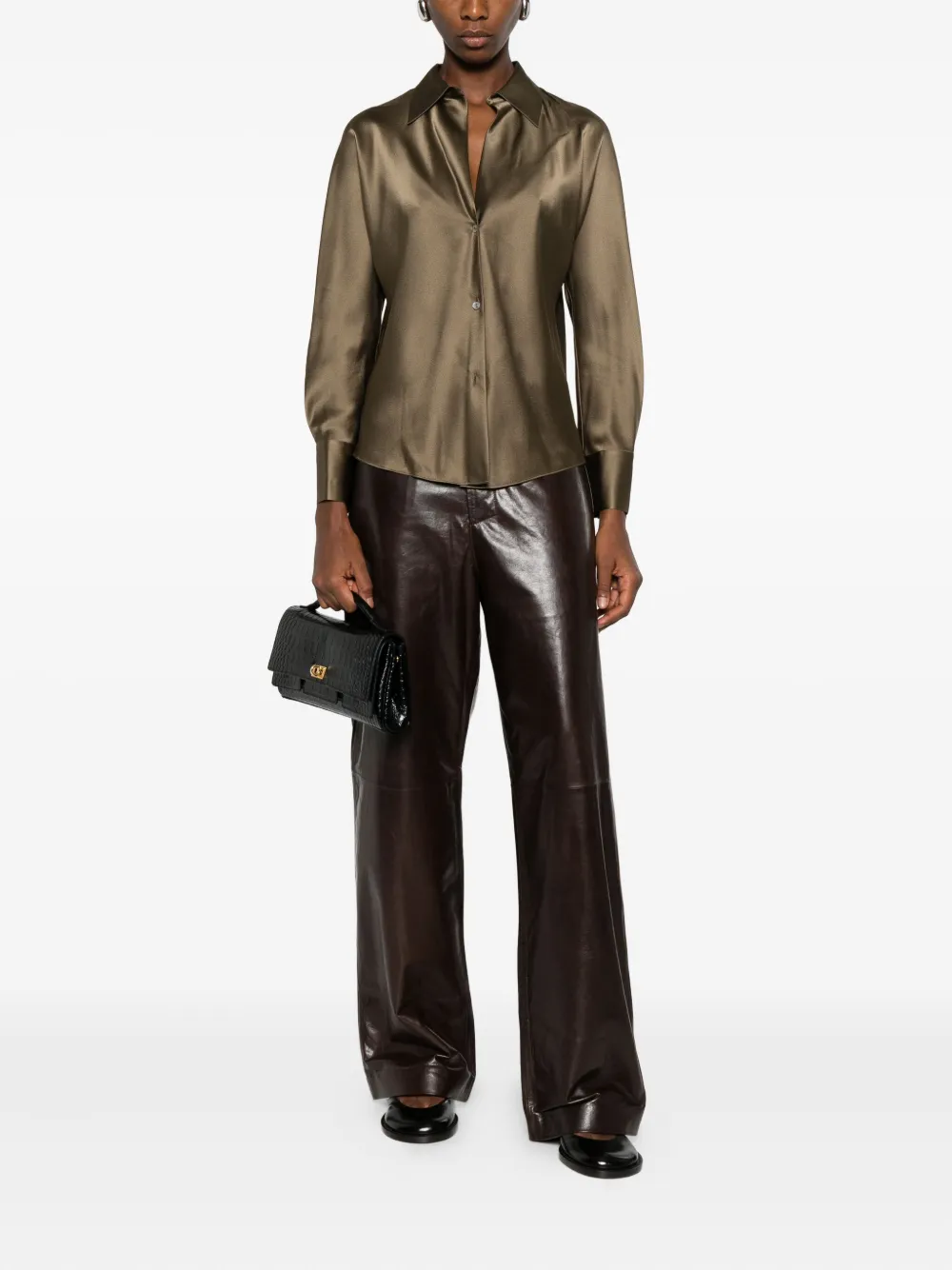 Коричневый сатинированная текстура застежка на пуговицы спереди классический воротник длинные рукава рукава с манжетами