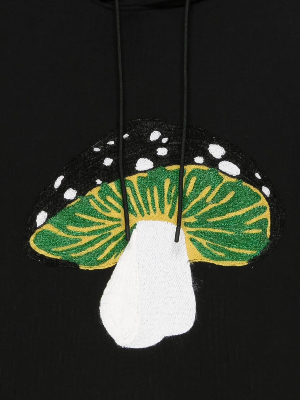 Черная худи с вышивкой в виде грибов, кулиской, длинными рукавами, ребристыми манжетами и ребристым подолом