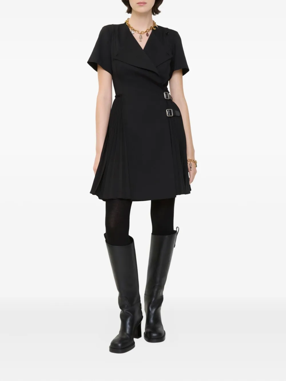 Черная плиссированная юбка с эффектом запаха, короткими рукавами, кожаными пряжками и застежкой на пуговицы