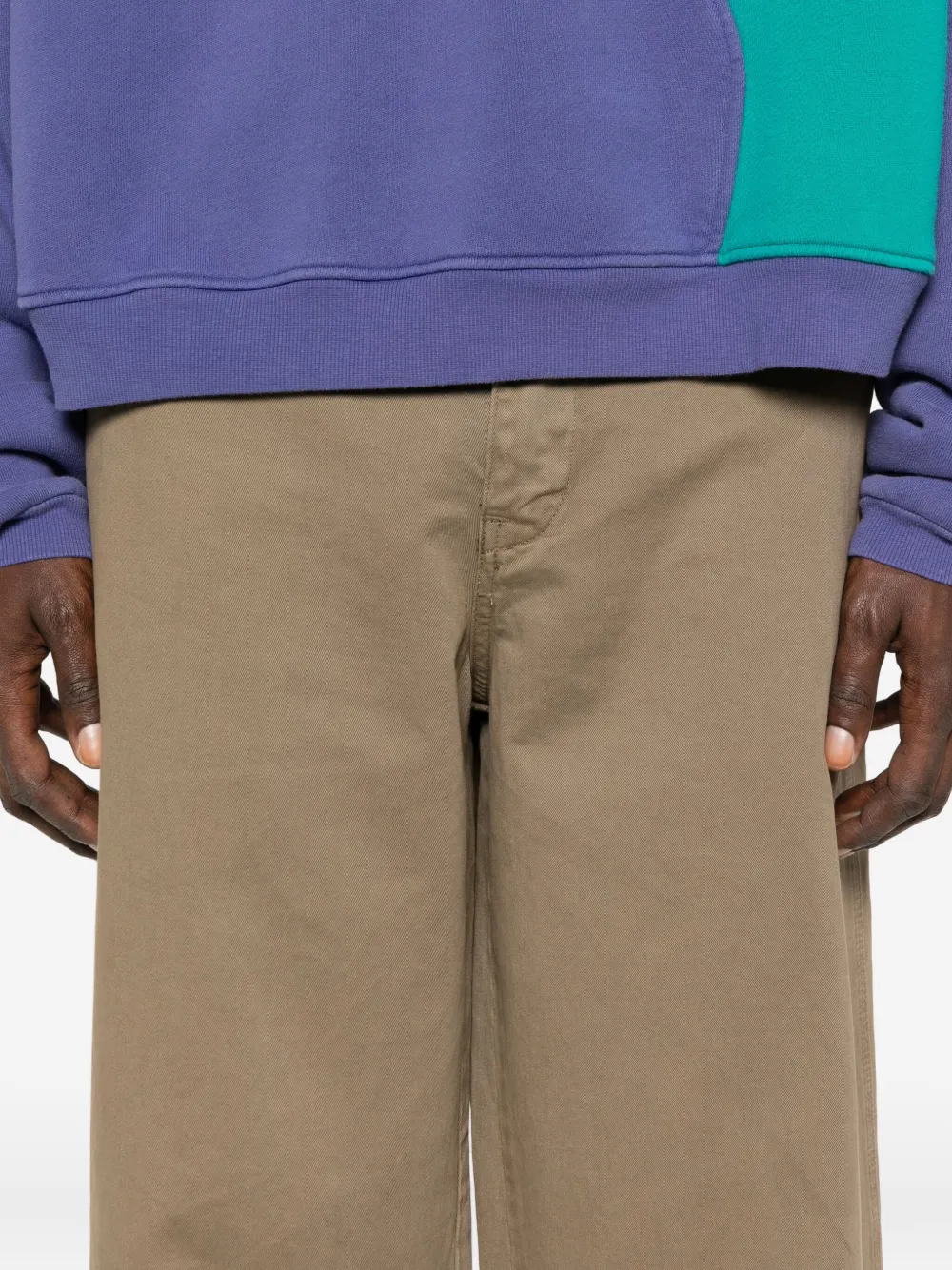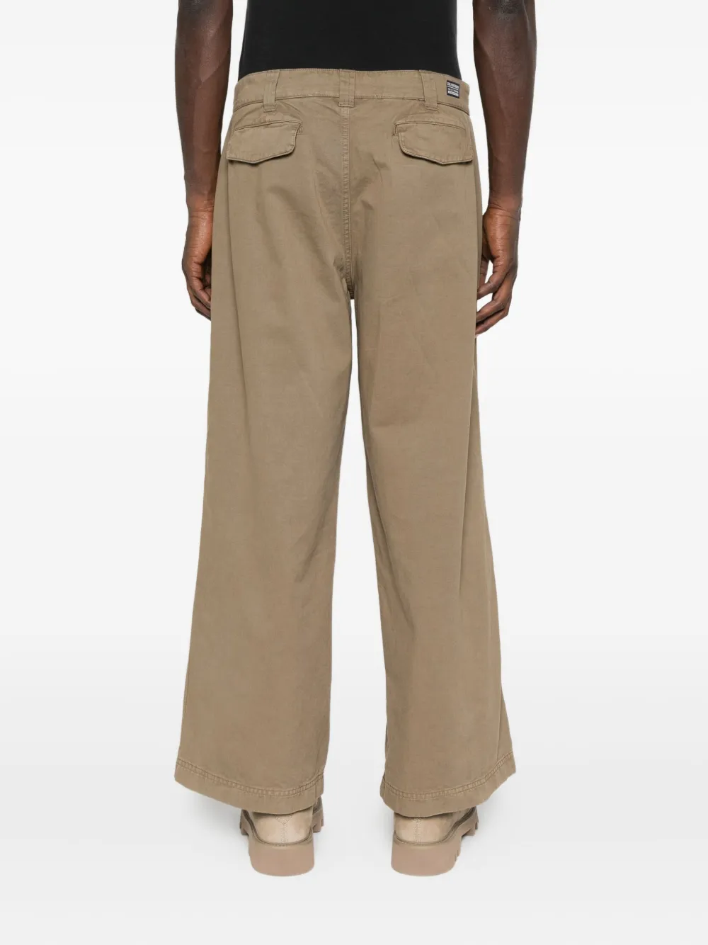 Тауповый бежевый боковые прорезные карманы застежка на пуговицу и молнию широкие брючины прямой нижний край плоский перед