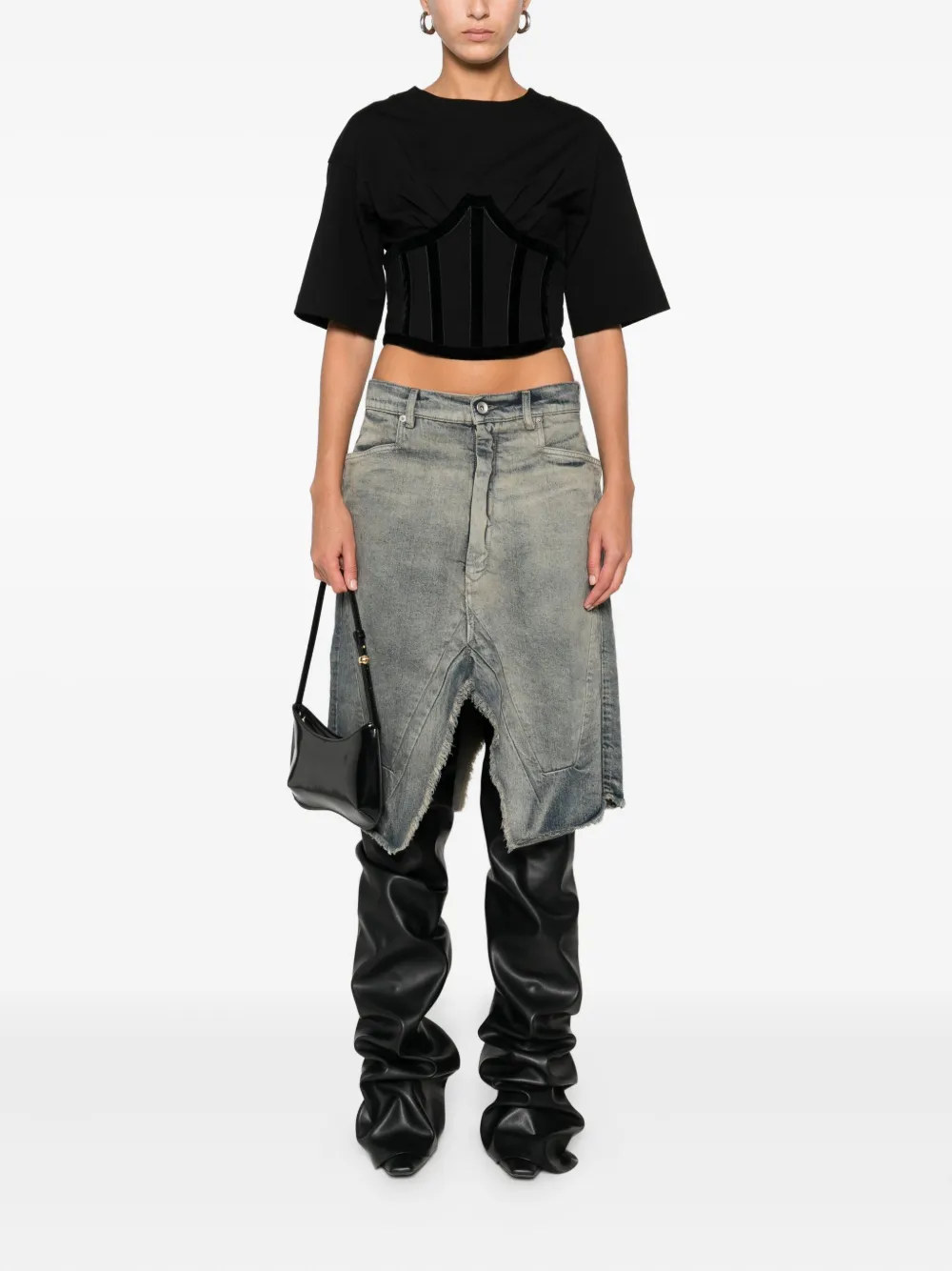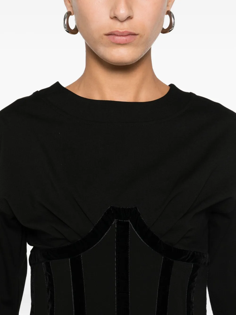 Черный короткие рукава вставка из вельветового корсета круглый вырез приталенный лиф укороченный подол
