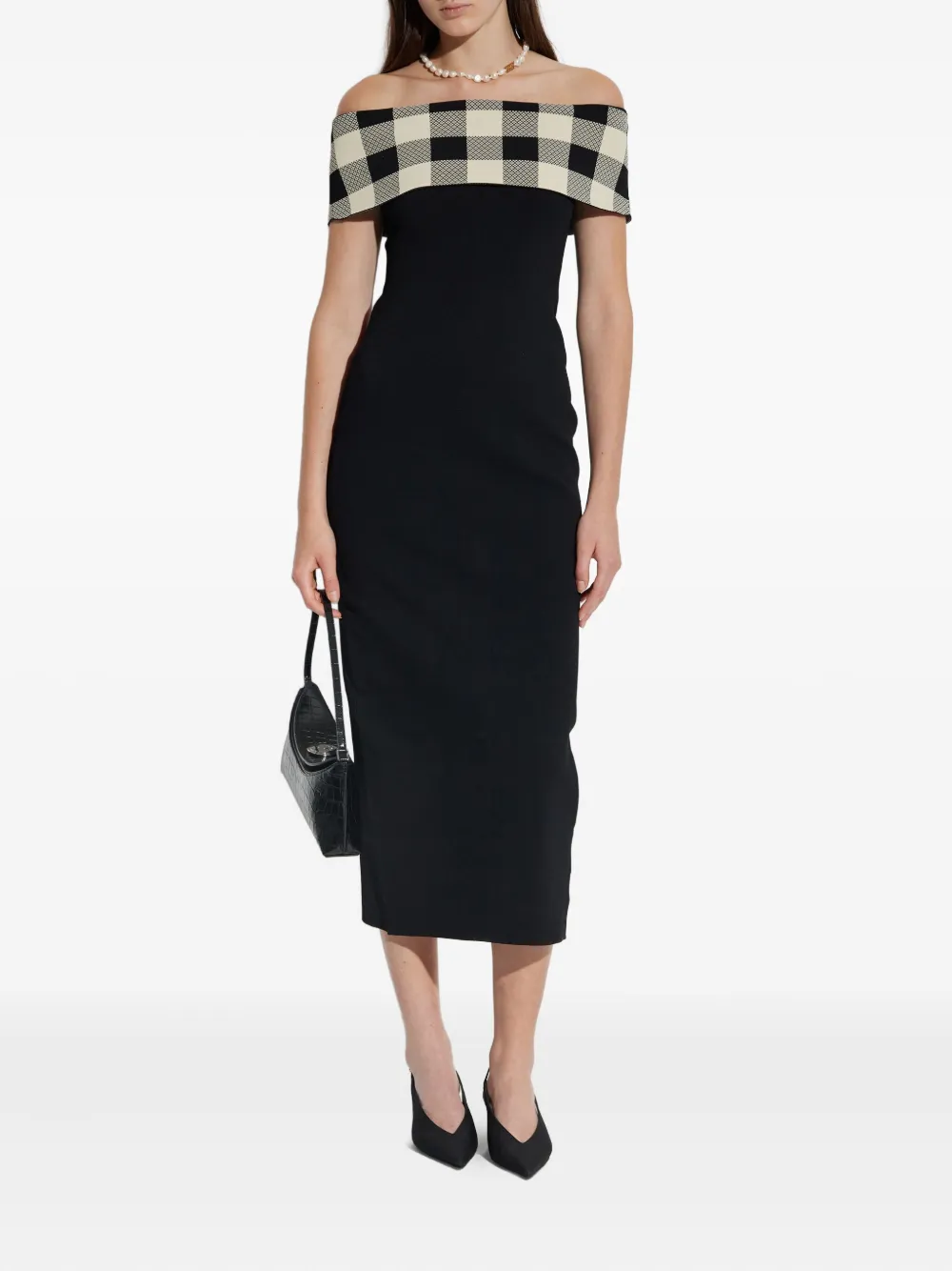 Черное платье в клетку с кокеткой, открытым плечом, короткими рукавами, приталенным лифом и длиной миди
